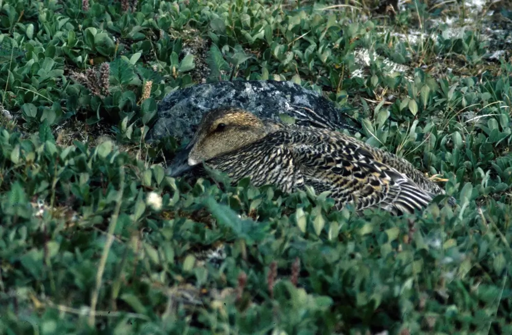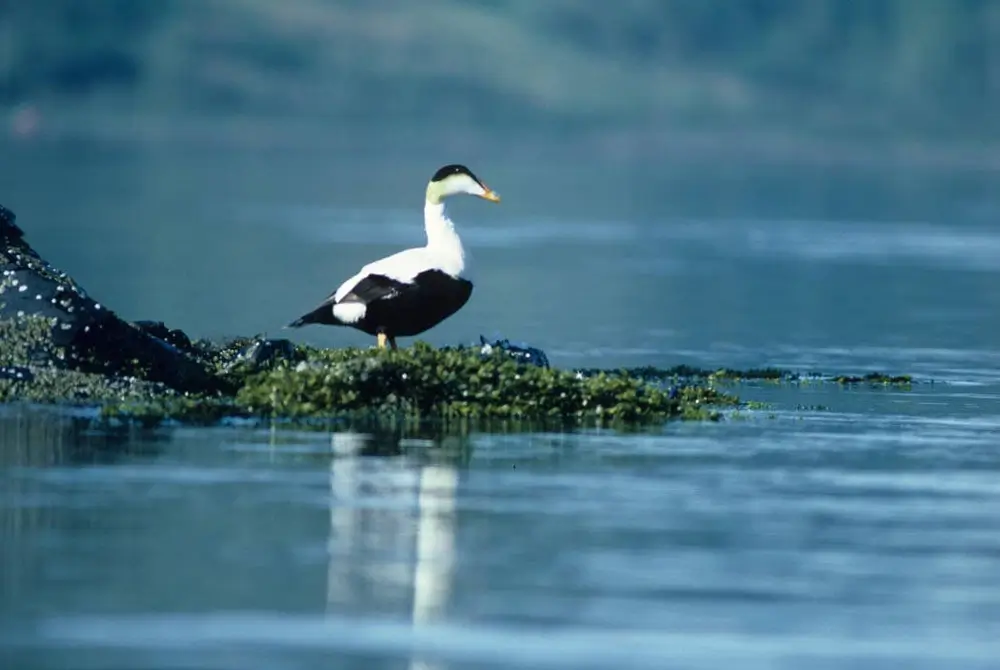 The common eider is found along rocky coasts and coastal tundra.