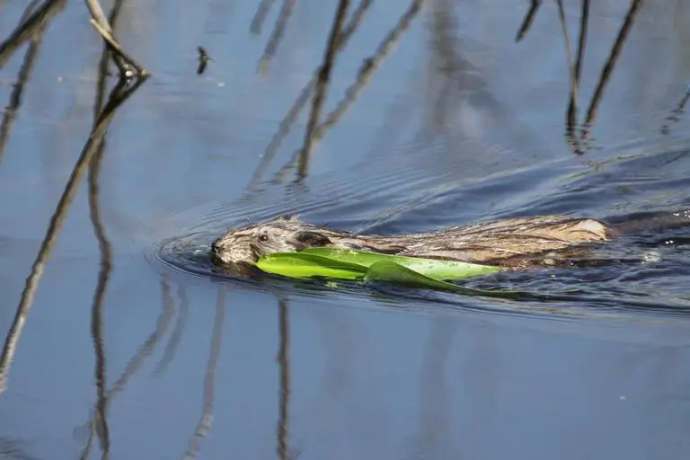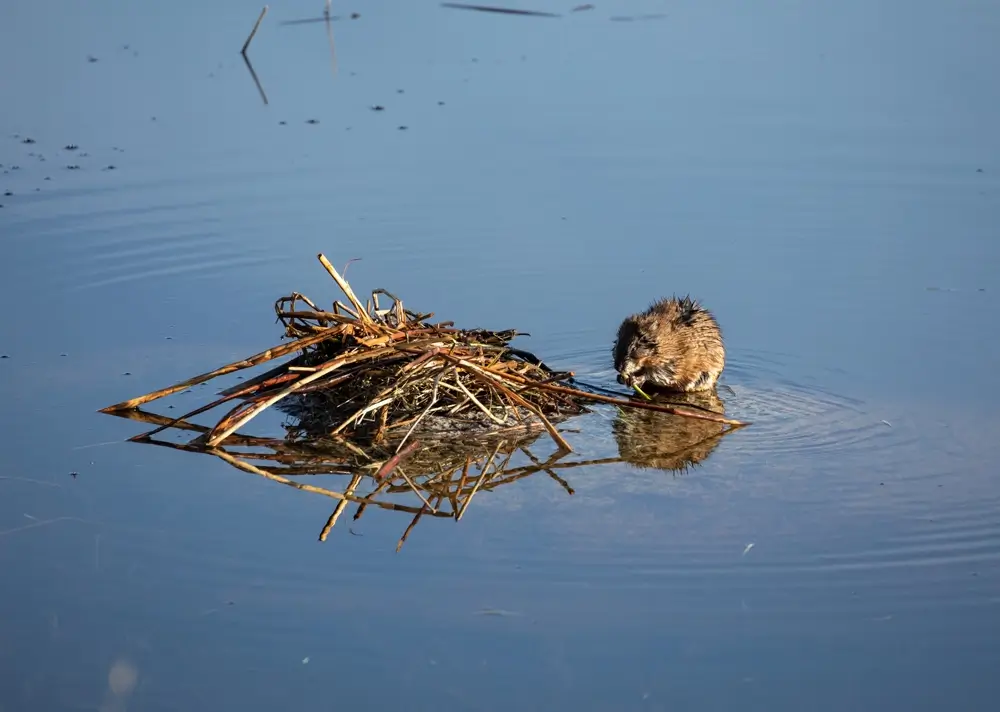 The muskrat doesn’t eat its food where it finds it; it usually drags its food out to a feeding platform in the water or a feeding station near one of its travel paths. These feeding platforms are made of mud and vegetation and allow the muskrat to eat its food without worrying about predators.
