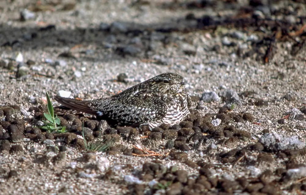 Mating season runs from April through July. The nighthawk doesn’t build a nest. The female lays from 1-3 eggs on the ground in an open, gravelly, or lightly vegetated area. In cities and towns, she often lays her eggs on a flat gravel-covered roof.