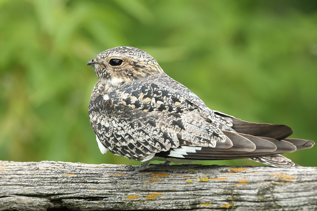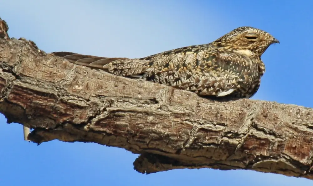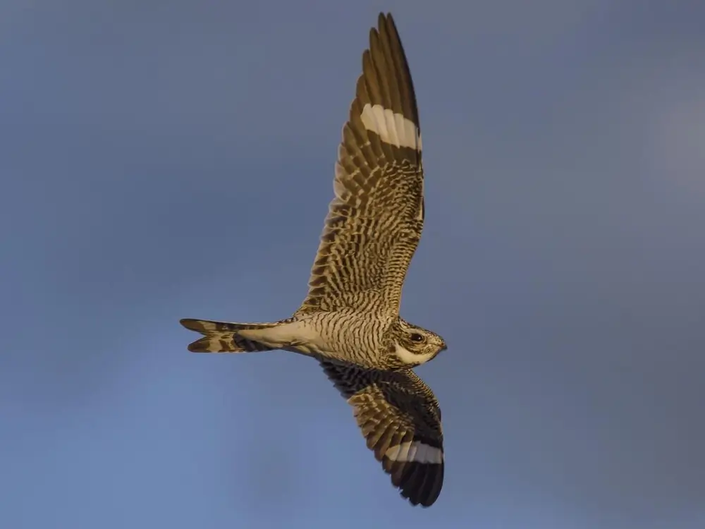 The common nighthawk has a large mouth with bristles that help it catch insects. Males have a white throat patch and a white tail bar. Females have a light brown or cinnamon-colored throat patch and no tail bar.