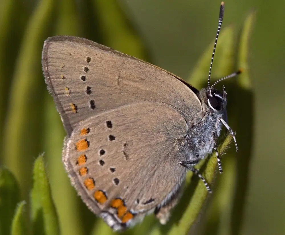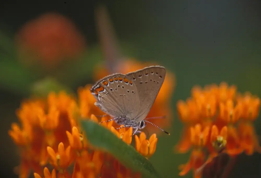 The coral hairstreak has a wingspan of 1-1.5 inches (2.5-3.8 cm) and no tail. The male’s wings are more pointed than the female’s wings.