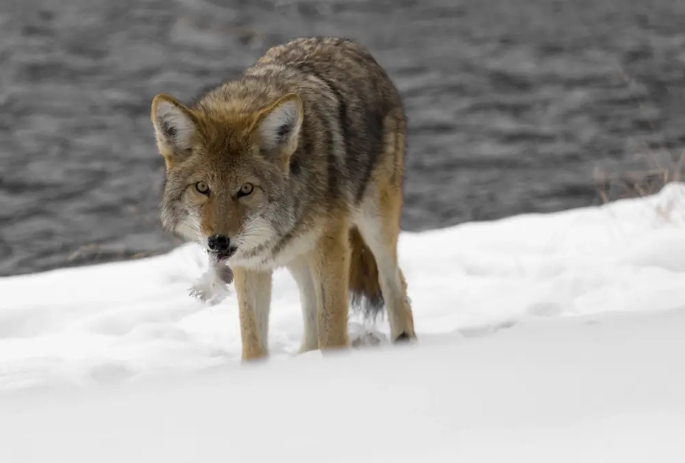 The coyote has grayish-brown to yellowish-brown fur on top and whitish fur on its underparts. It has large triangular ears on the top of its head and a long, narrow muzzle. It has a black nose, yellow eyes, and a long, bushy tail.