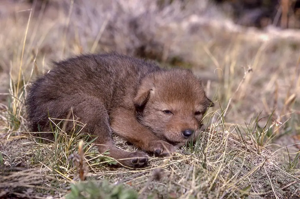 The pups are born blind and with floppy ears. They open their eyes in about ten days. The male coyote hunts for food for the female. She then regurgitates the food for her pups.