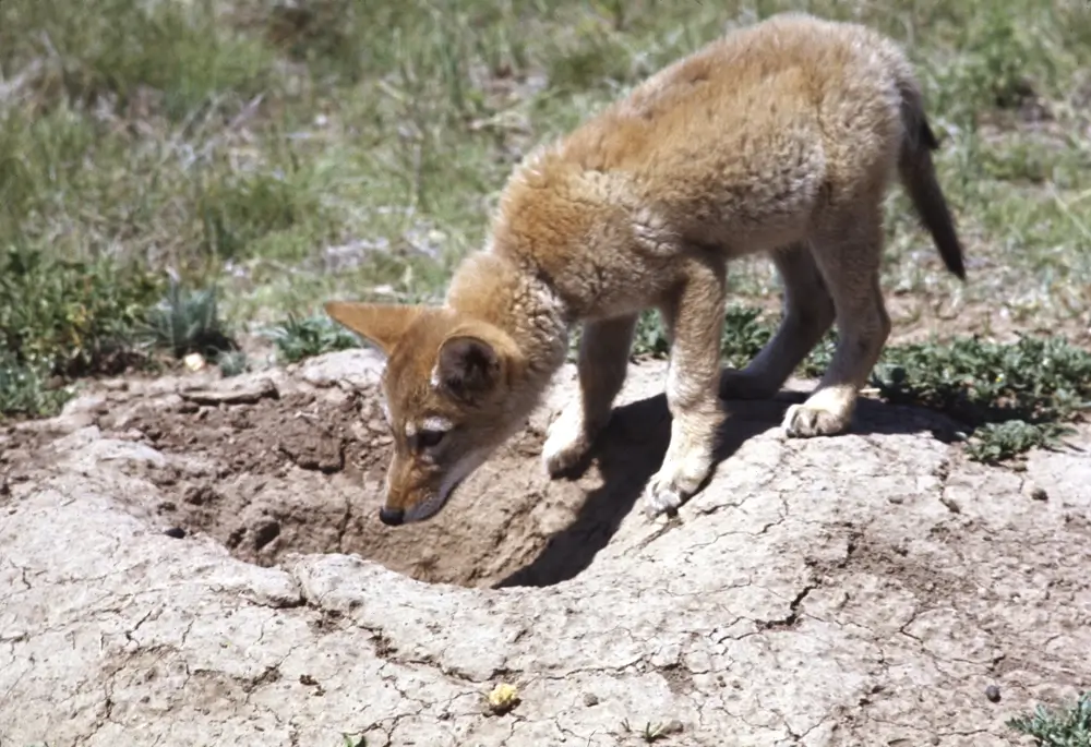 The coyote is found in a variety of habitats, including fields, plains, and bushy areas. The coyote makes its den in a rocky crevice, log, cave, or the den of another animal.