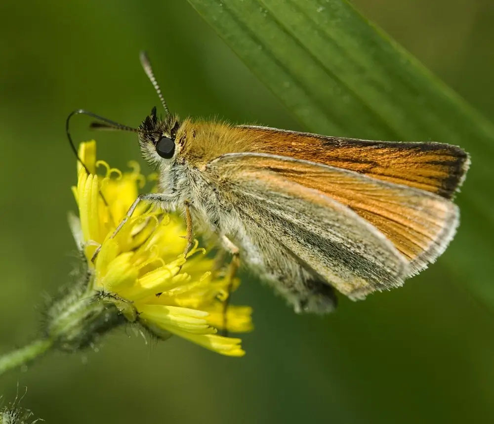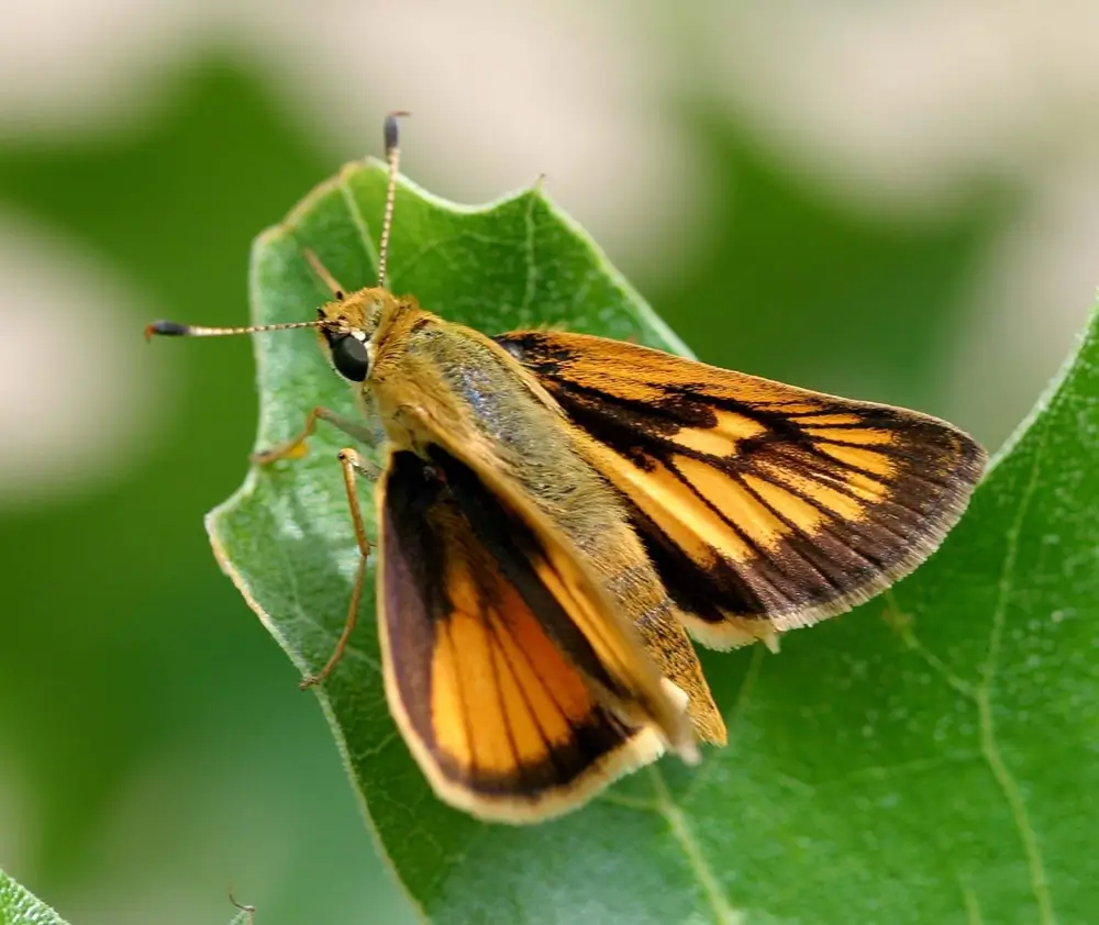 The Delaware skipper has a wingspan of 1-1.5 inches (2.5-3.8 cm). The uppersides of its wings are a bright yellowish-orange and have a dark brown to black border with black veins. The undersides of its wings are a solid yellowish-orange.