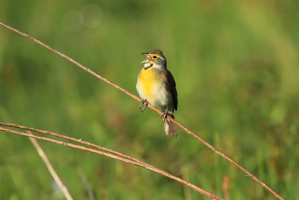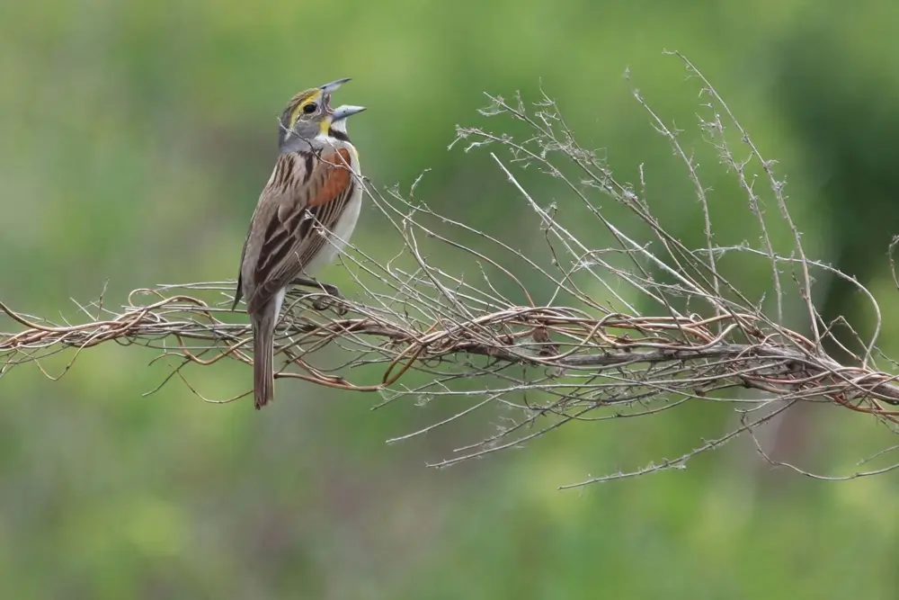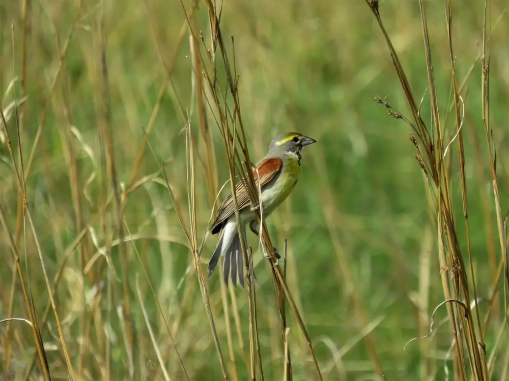 The dickcissel is found in grain fields and weedy areas.