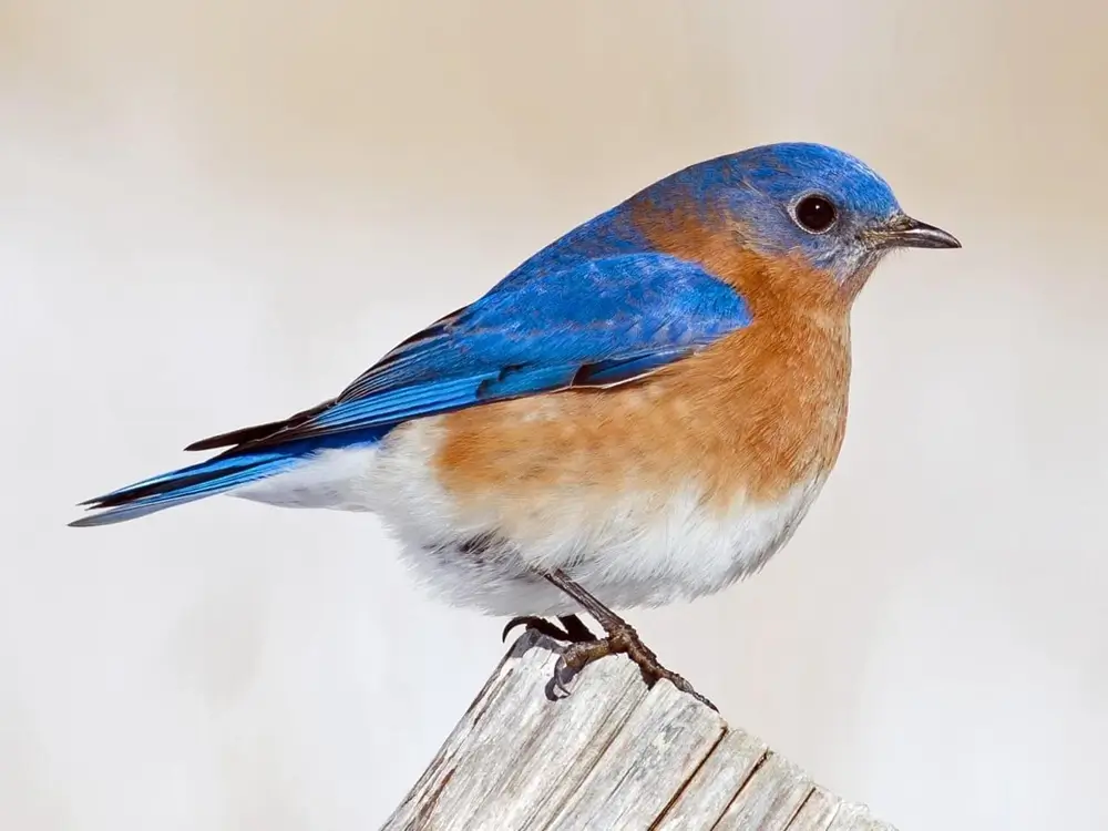 The male has a bright blue back with a rusty-red and white belly. The female eastern bluebird is gray and brown with blue areas on her wings and tail.