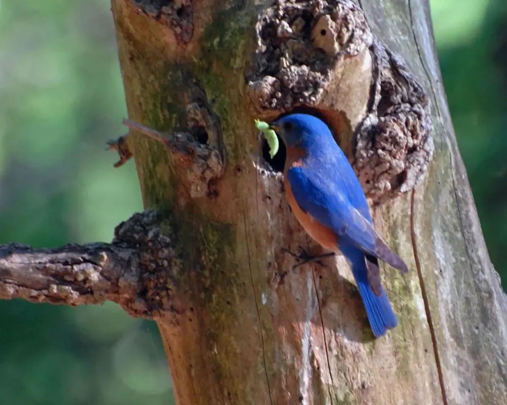 Breeding occurs in the spring and summer. The eastern bluebird builds its nest in a tree cavity or a man-made nest box. The female builds the nest by weaving together grasses and pine needles and lines the nest with fine grasses and soft, downy material. She may use this nest several times.