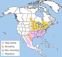 The eastern bluebird has a very large range. It is found east of the Rocky Mountains, from Southern Canada to the Gulf Coast and into Mexico and Central America.