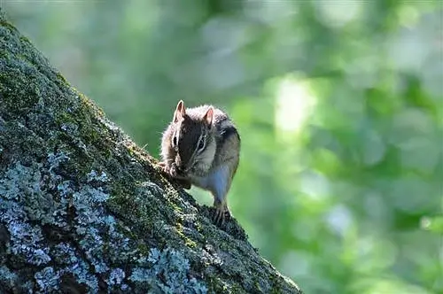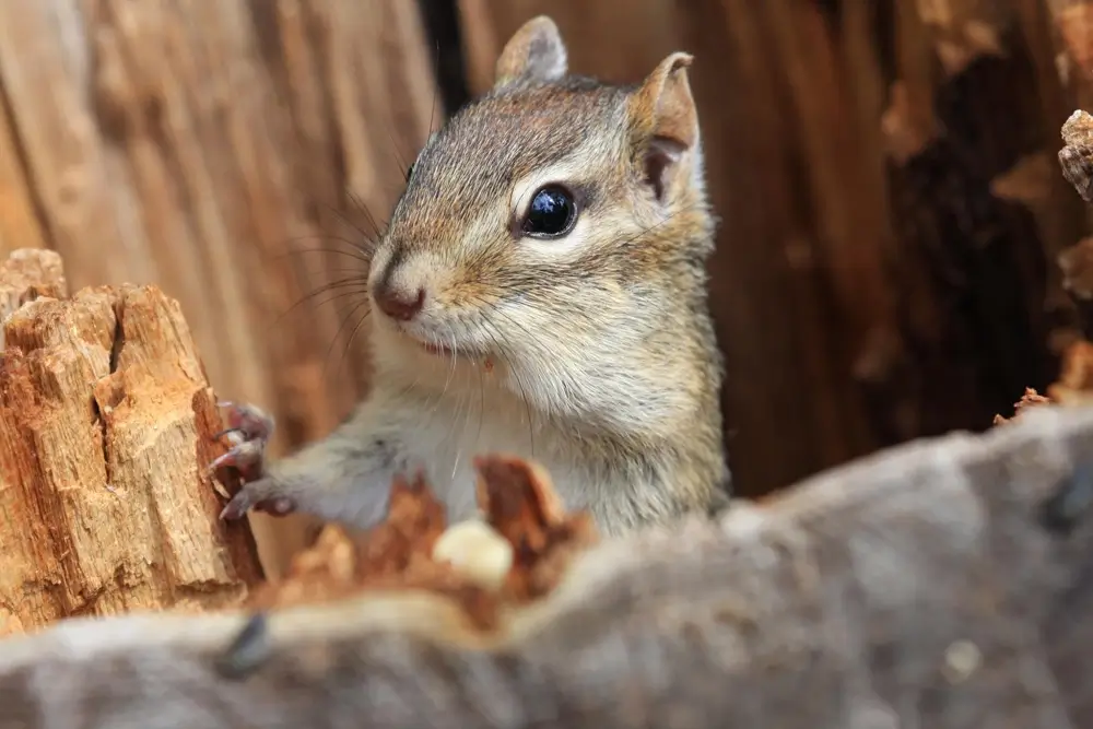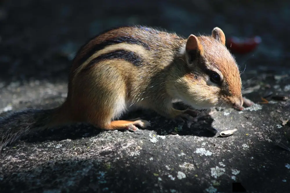 The eastern chipmunk lives in open deciduous forests and at the edges of woodlands. It is also found in bushy and rocky areas near walls, houses, and other buildings.