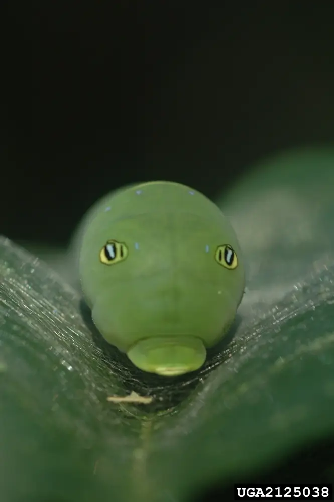 When the eastern tiger swallowtail caterpillar matures it is green with orange and black false eyespots. The eye spots are a type of deceptive coloration that helps protect the caterpillar from predators. Predators see the eye spots and think that the caterpillar is a much larger animal than it really is.