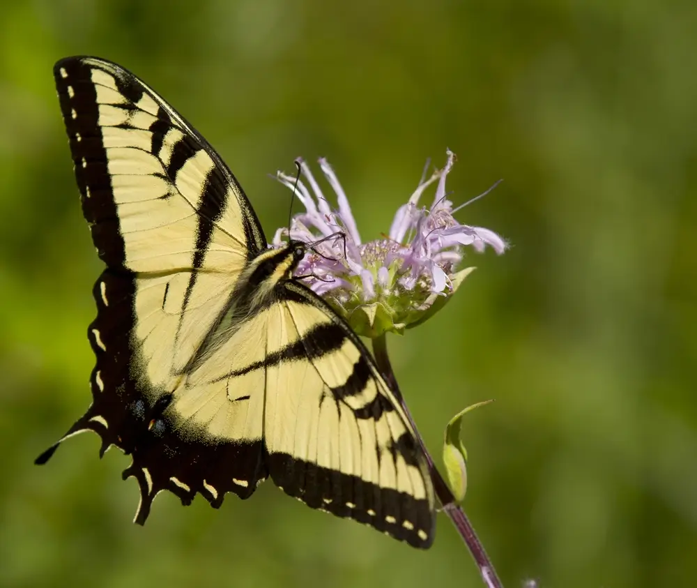 The eastern tiger swallowtail is found in deciduous woods along streams, rivers, and swamps.