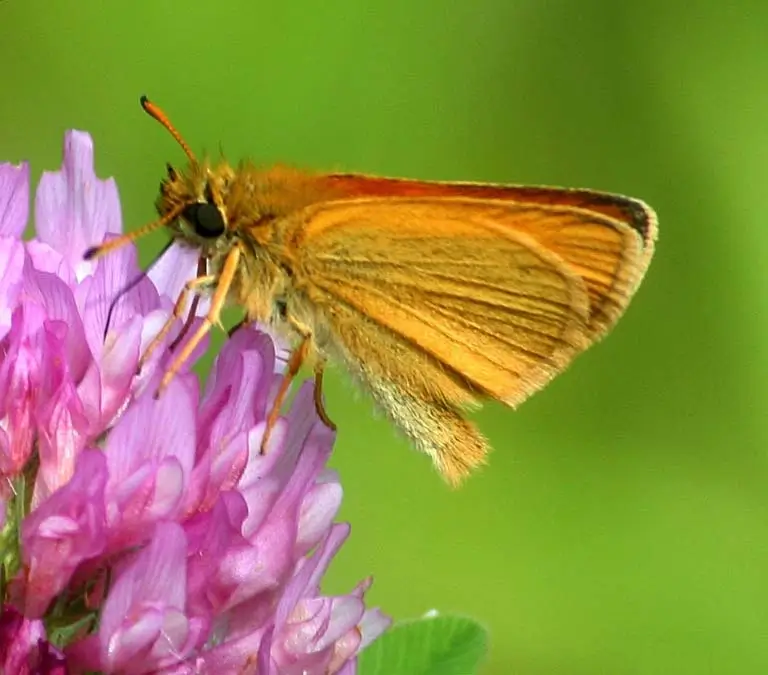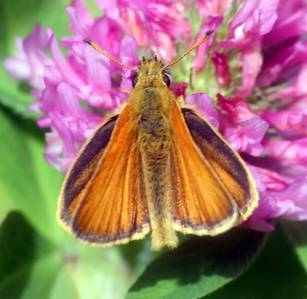 The adult European skipper eats nectar from low-growing flowers like thistles, ox-eye daisy, fleabane, white clover, red clover, orange hawkweed, common milkweed, and swamp milkweed.