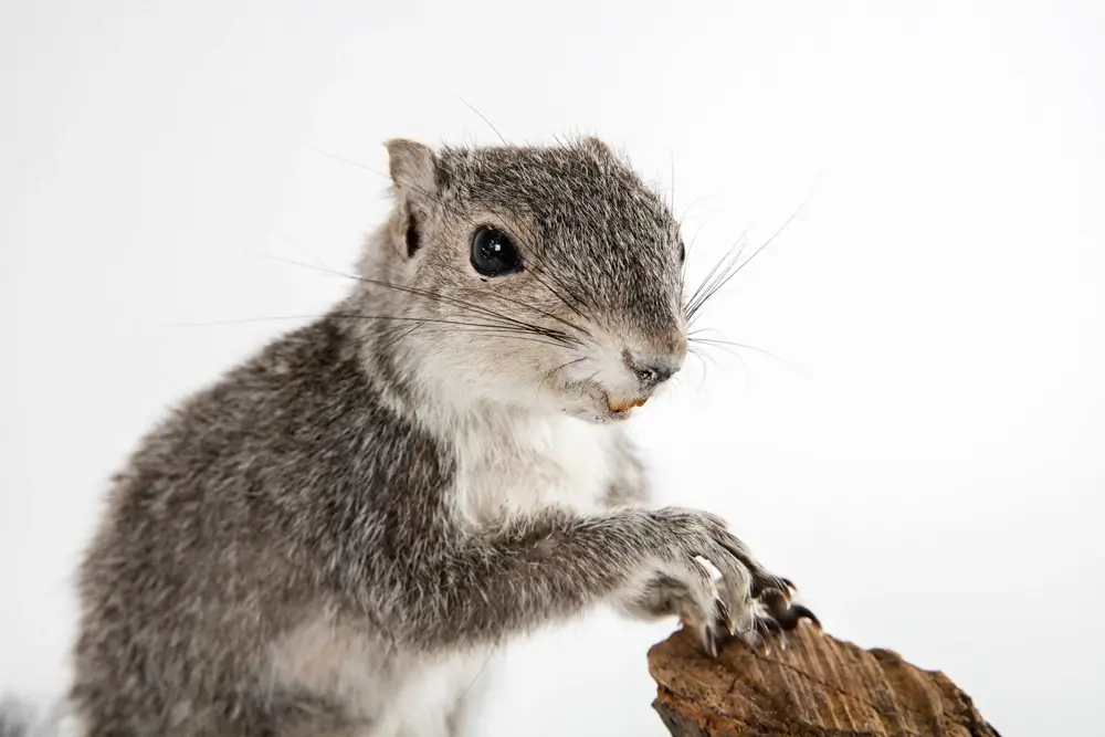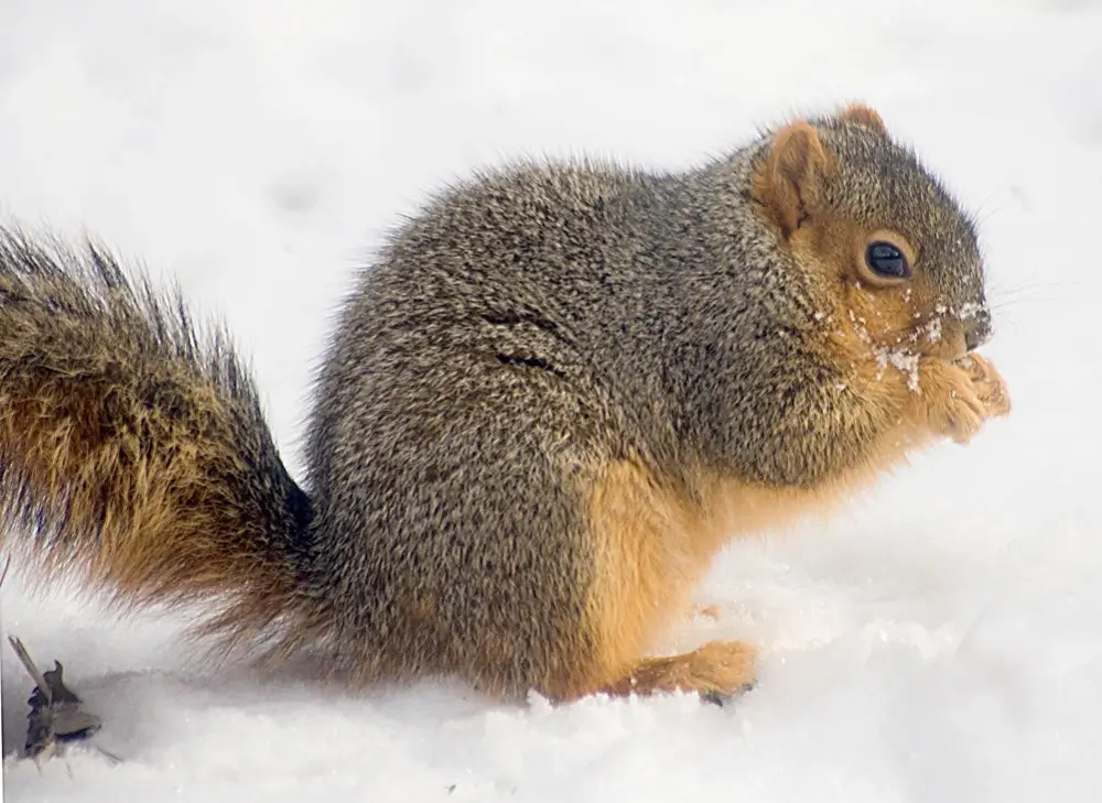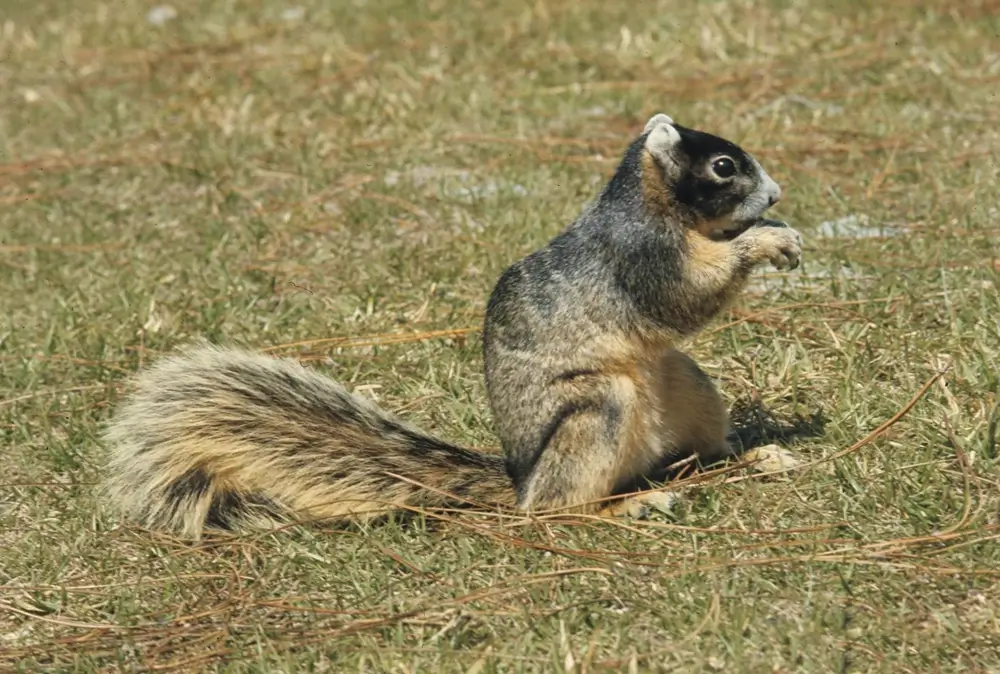 In the western part of its range, it is gray above and rust-colored on its undersides. In the southern part of its range, it is black and brown with a white stripe on its face and a white tip on its tail. The fox squirrel is also known as the eastern fox squirrel.