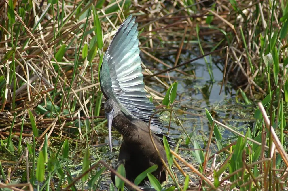 The glossy ibis sometimes stretches out its wings and sunbathes.