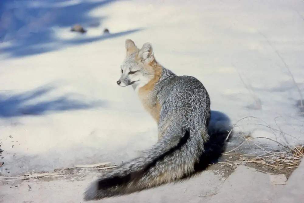 The gray fox is a peppery gray on top. It is reddish-brown on its sides, chest, and the back of its head. Its legs and feet are also a reddish color. It has a long bushy tail with a black stripe on top. The gray fox has pointed ears, a pointed muzzle, and long, hooked claws.