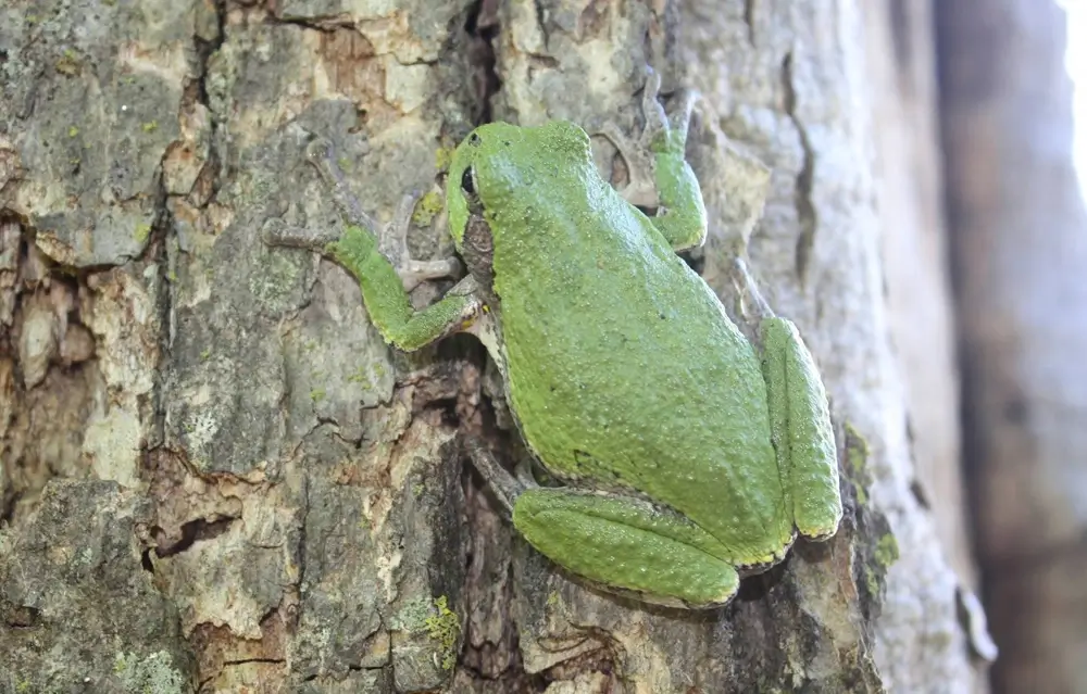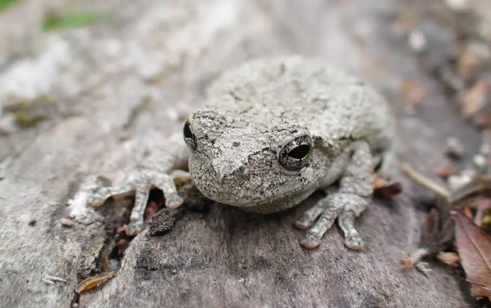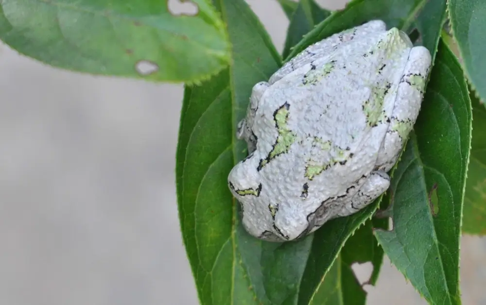 The gray treefrog can change its color in seconds. It tends to become darker when it is cold or dark. Its coloring helps it blend in with tree bark.