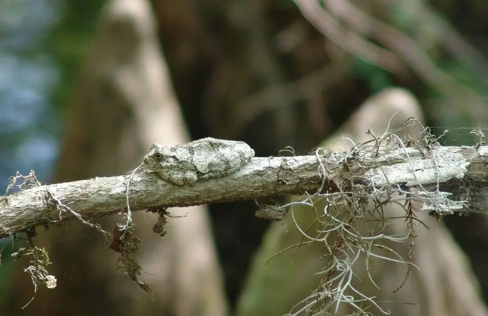 The gray treefrog lives in moist, deciduous woodlands and swamps near water. It is also found in pine barrens.