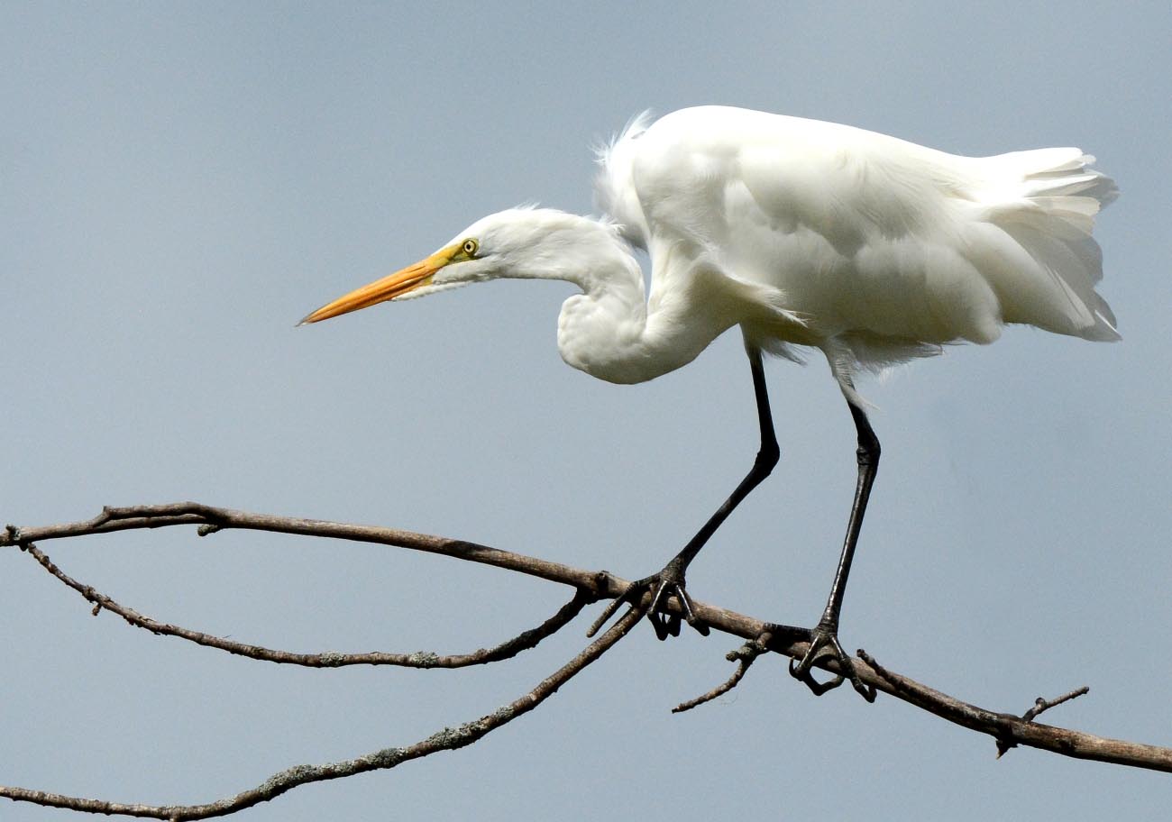 The great egret lives along salt and freshwater marshes, marshy ponds, and tidal flats.