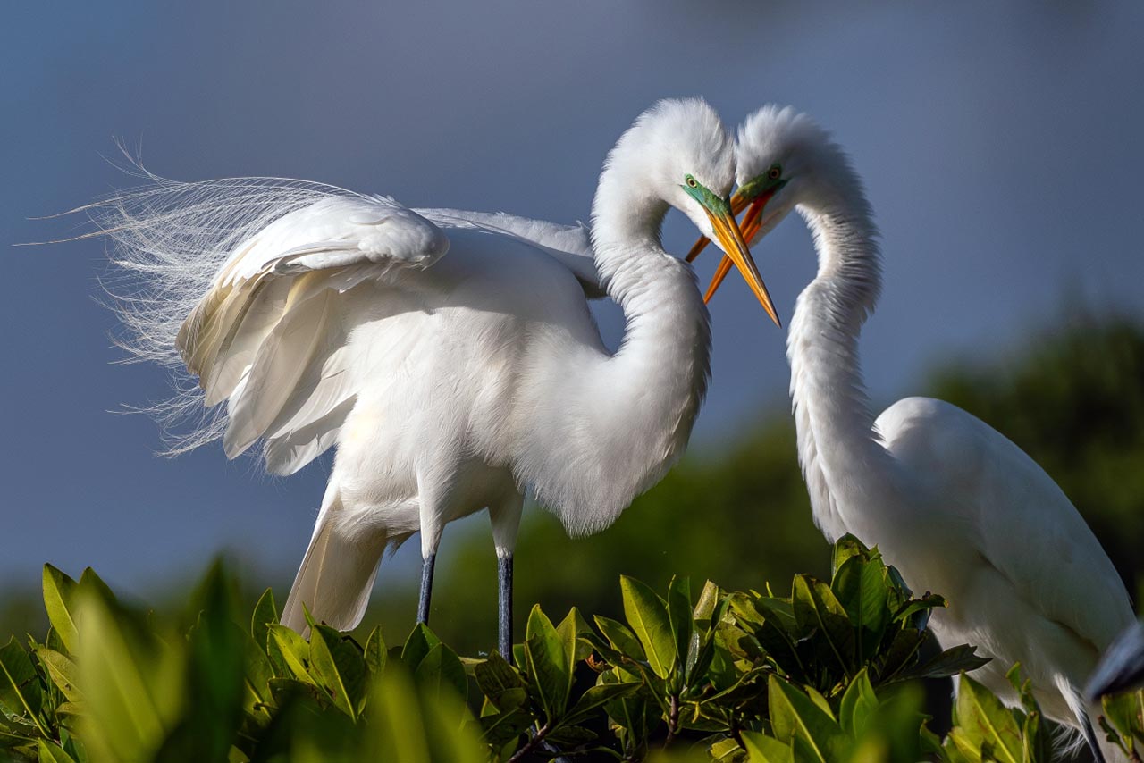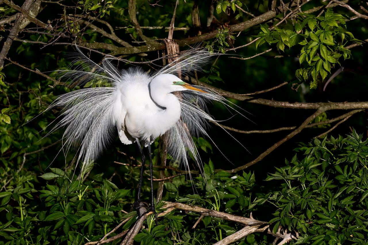When the great egret is in breeding plumage, it has long, lacy, and delicate plumes on its back that curl over its tail. Males and females look alike, but males are a little larger.