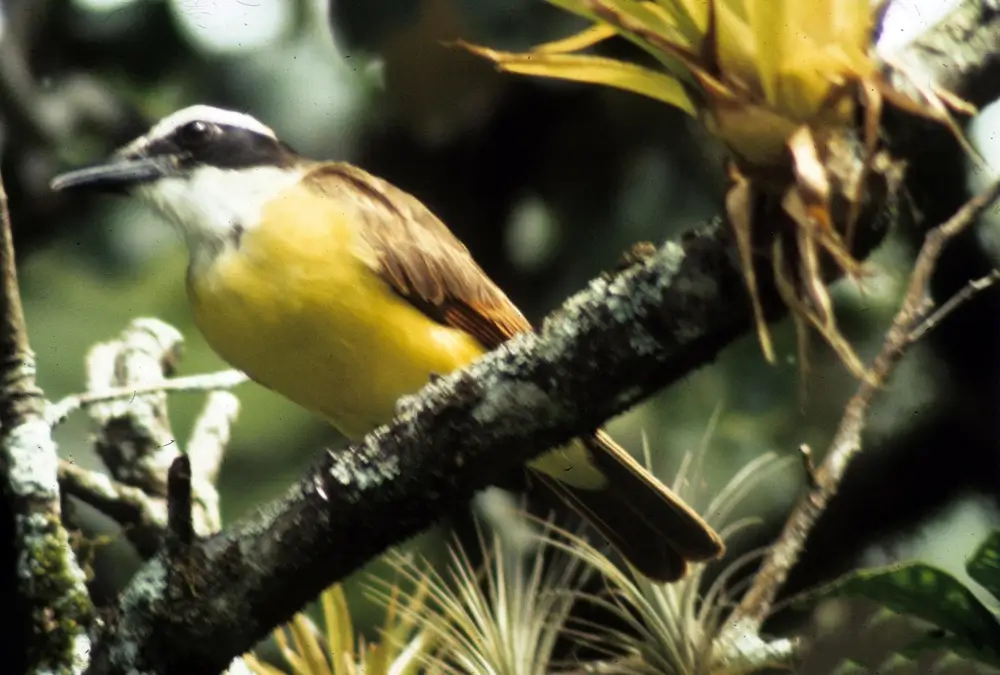 The great kiskadee lives in open woodlands, streamside thickets, groves, orchards, and parks.