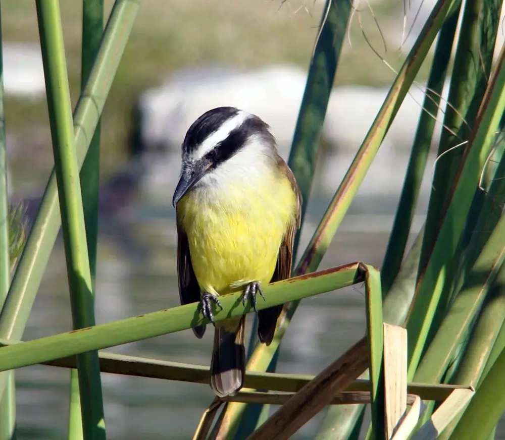 The great kiskadee travels in pairs and aggressively protects its nesting territory. One of its most feared predators is the coral snake. The kiskadee will avoid anything with the same color pattern as the coral snake.