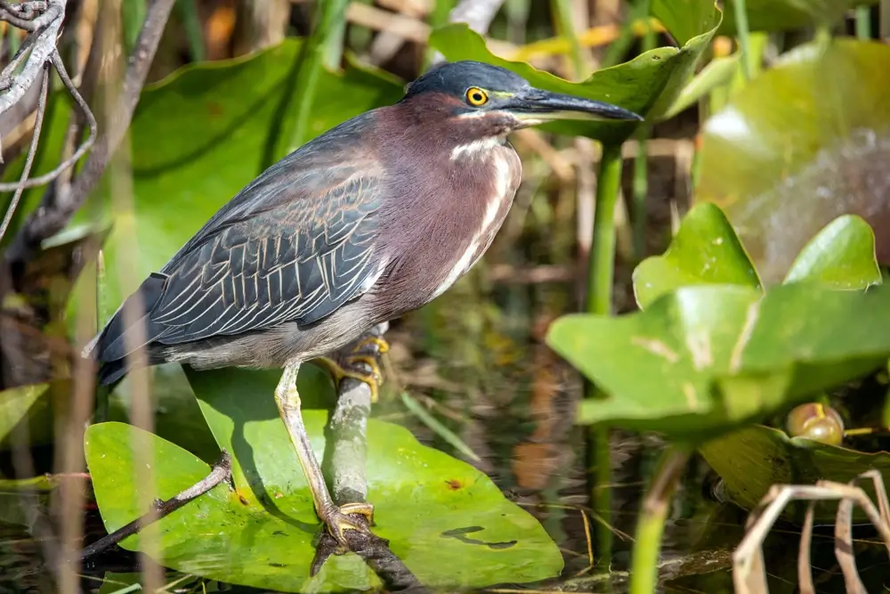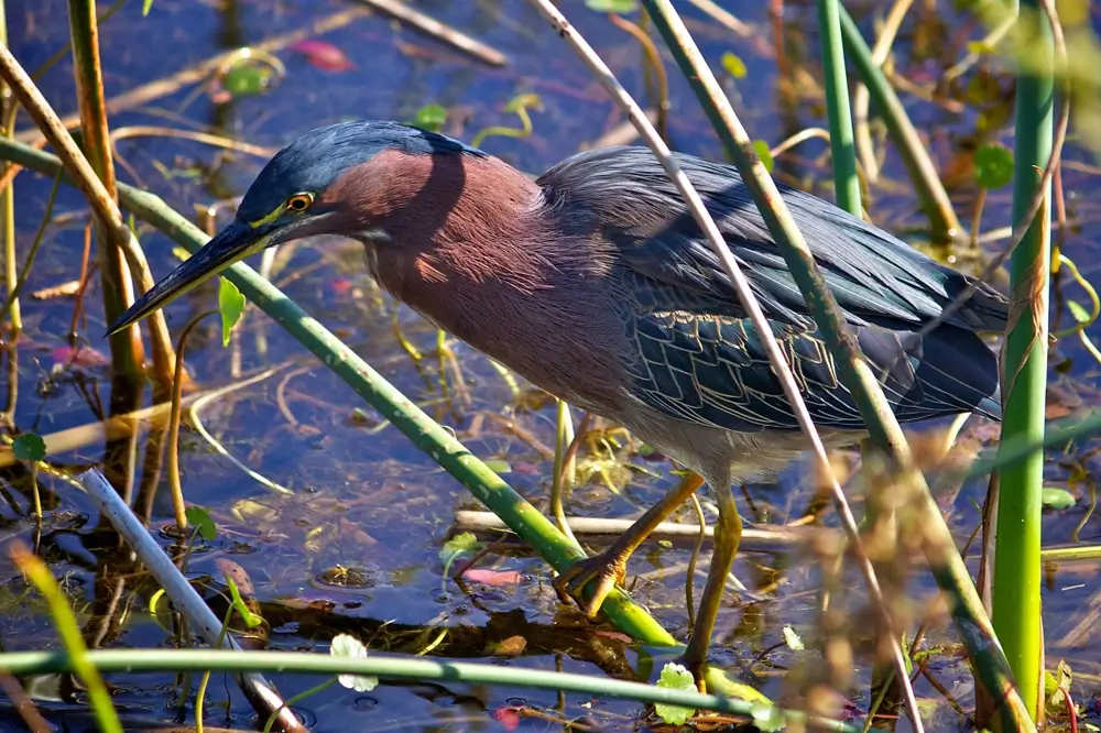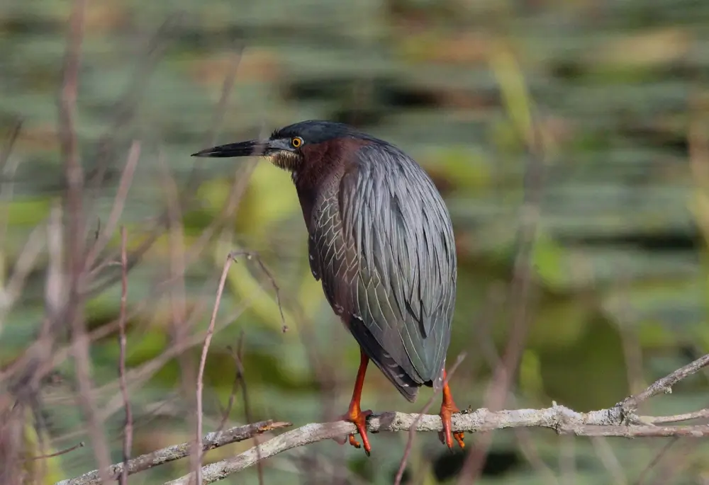 The green heron lives in freshwater or brackish water marshes with clumps of trees.