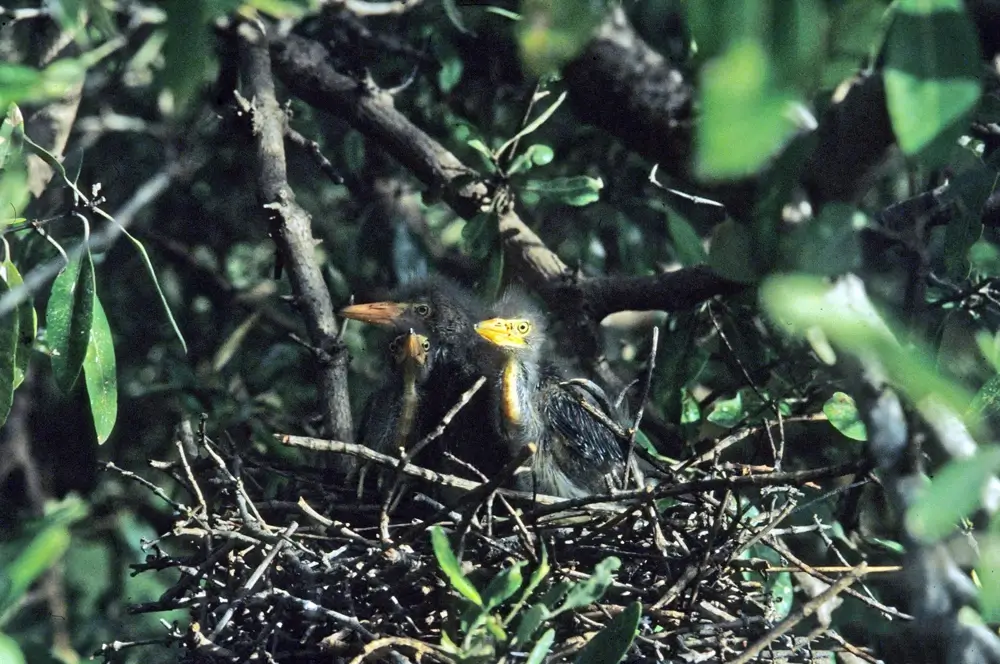 The female green heron lays three to six eggs in a nest made of sticks. Both the female and the male make the nest. The male gathers the materials and the female constructs the nest.
