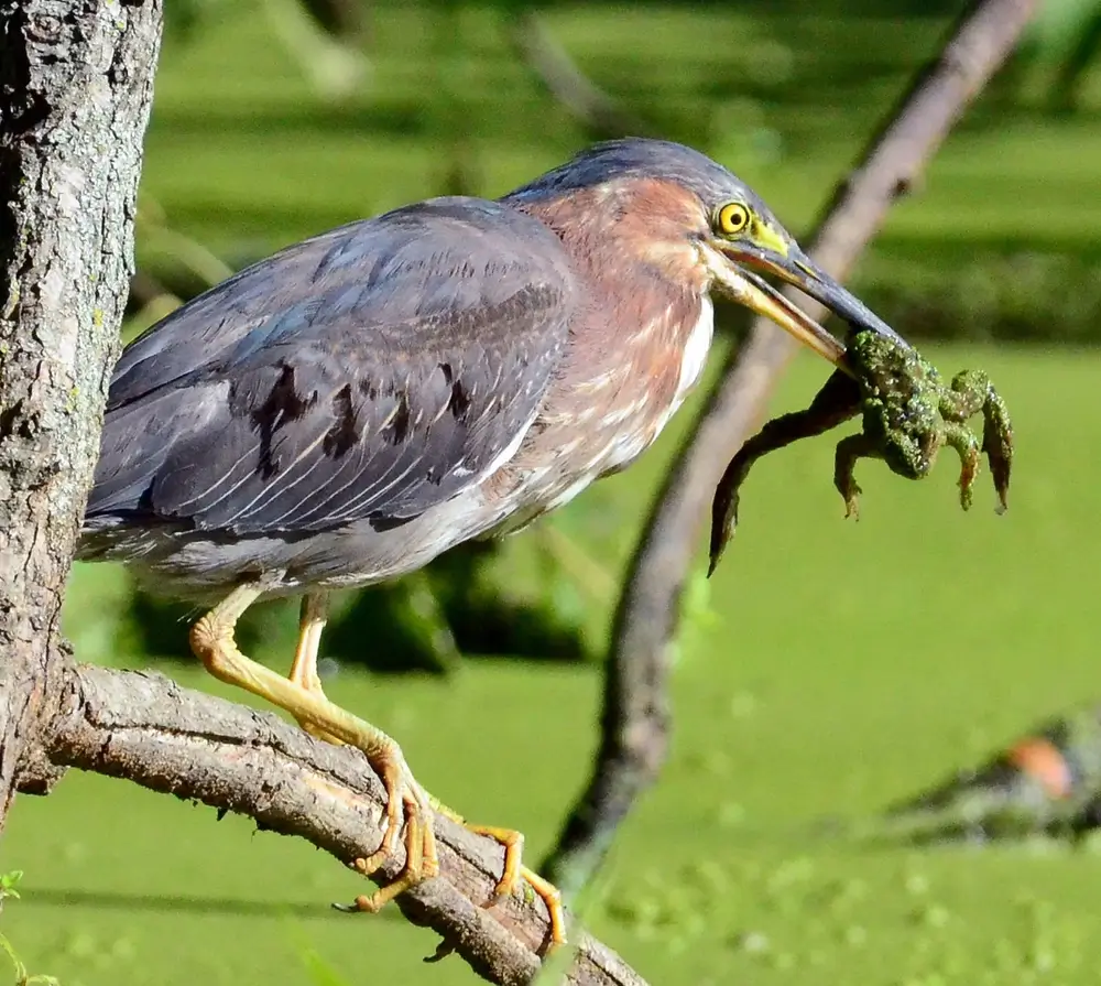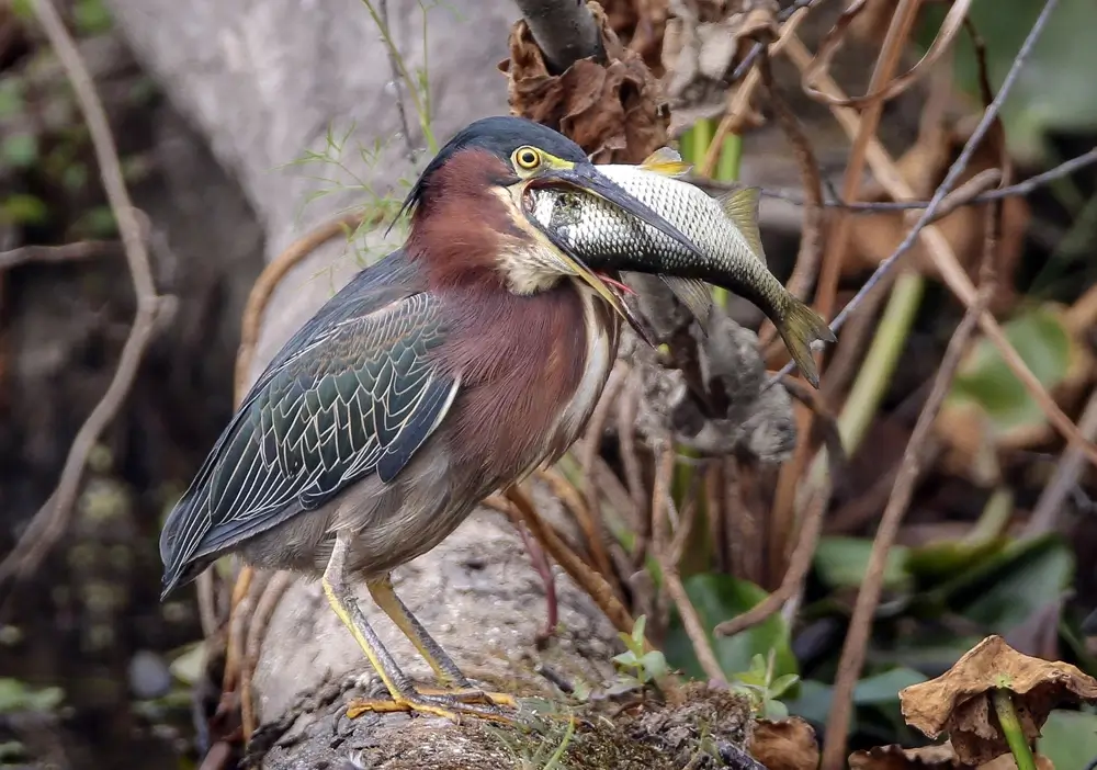 Sometimes the green heron uses “bait” to catch a fish. It drops a feather or a small stick on the surface of the water to attract its prey close enough to snatch up.