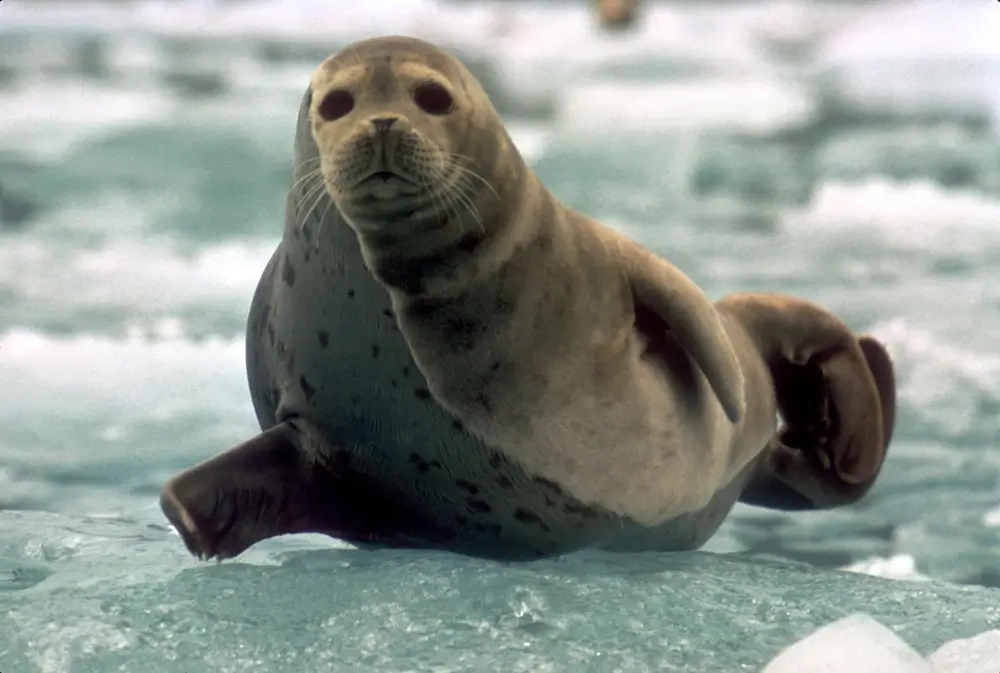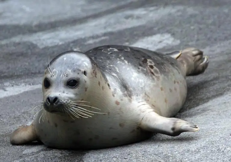The harbor seal has webbed hind flippers that also have five digits. The first and fifth digits are longer than the middle digits, and its hind flippers look like fans when they lie flat. It has a short, flattened tail between its hind flippers. The harbor seal moves its hind flippers from side to side to propel itself through the water.