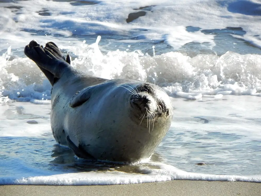 The harbor seal will “haul out” of the water and rest on rocks with its head raised and its rear flippers in the air in what is called the banana position. The harbor seal usually hauls out in the same area.