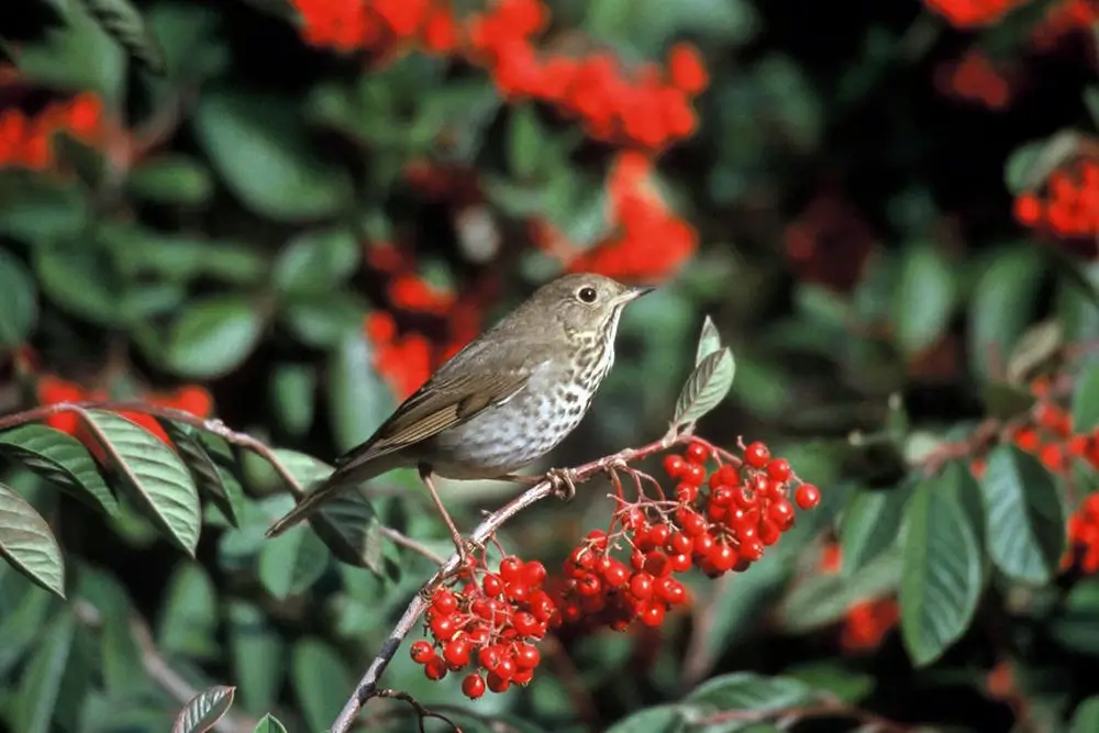 In the winter, wild berries become a main portion of the hermit thrush’s diet.