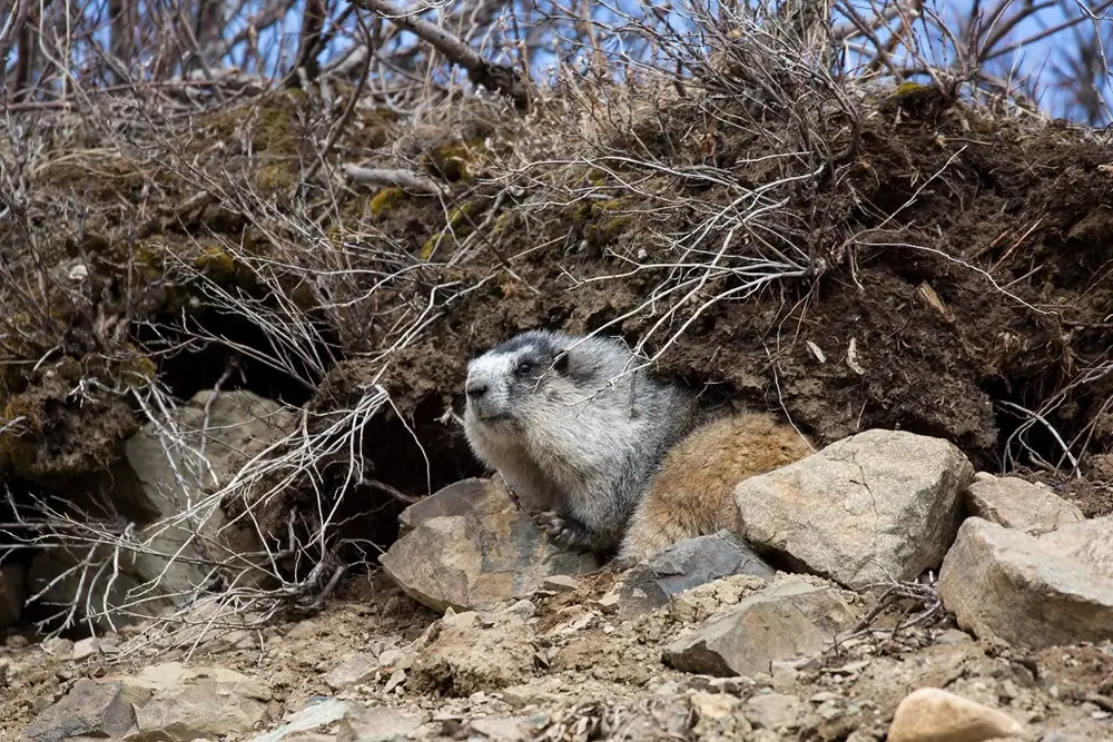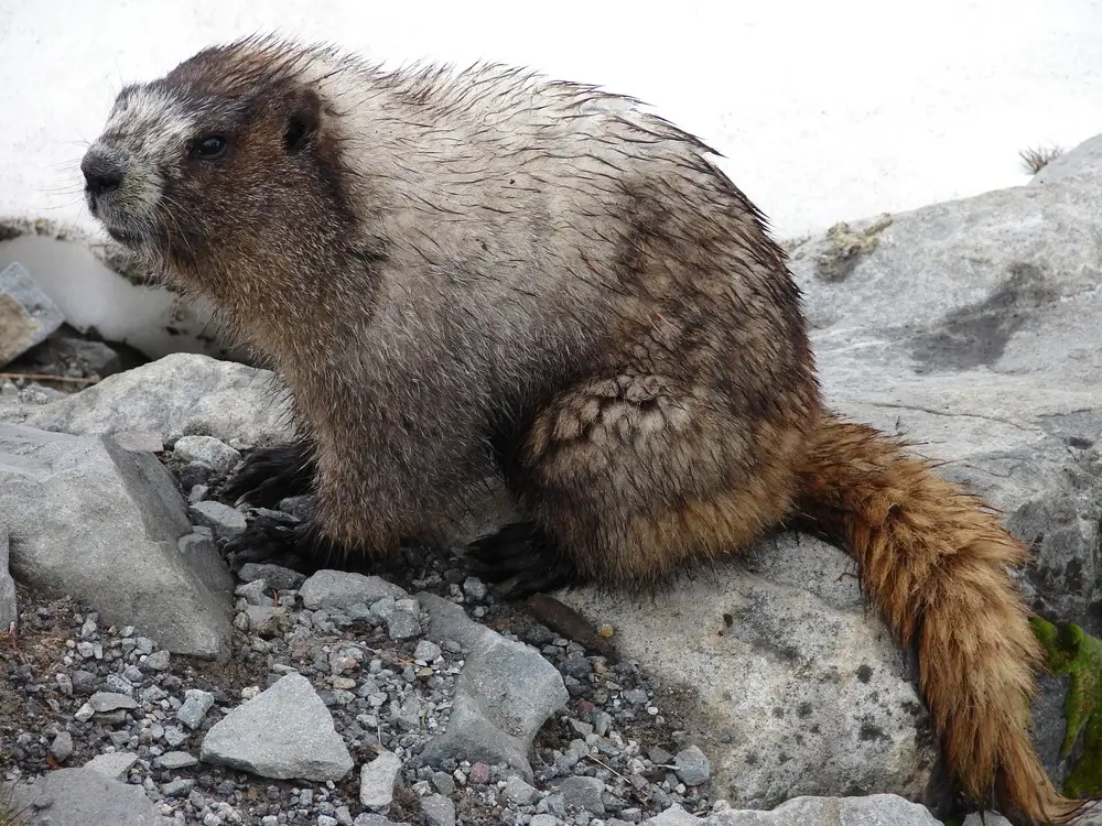 The hoary marmot is found on rocky mountain slopes and hillsides and in alpine meadows.