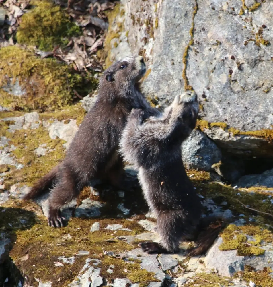 Hoary marmots often wrestle with each other for hours. They stand on their hind legs and put their front paws together, and push at each other.