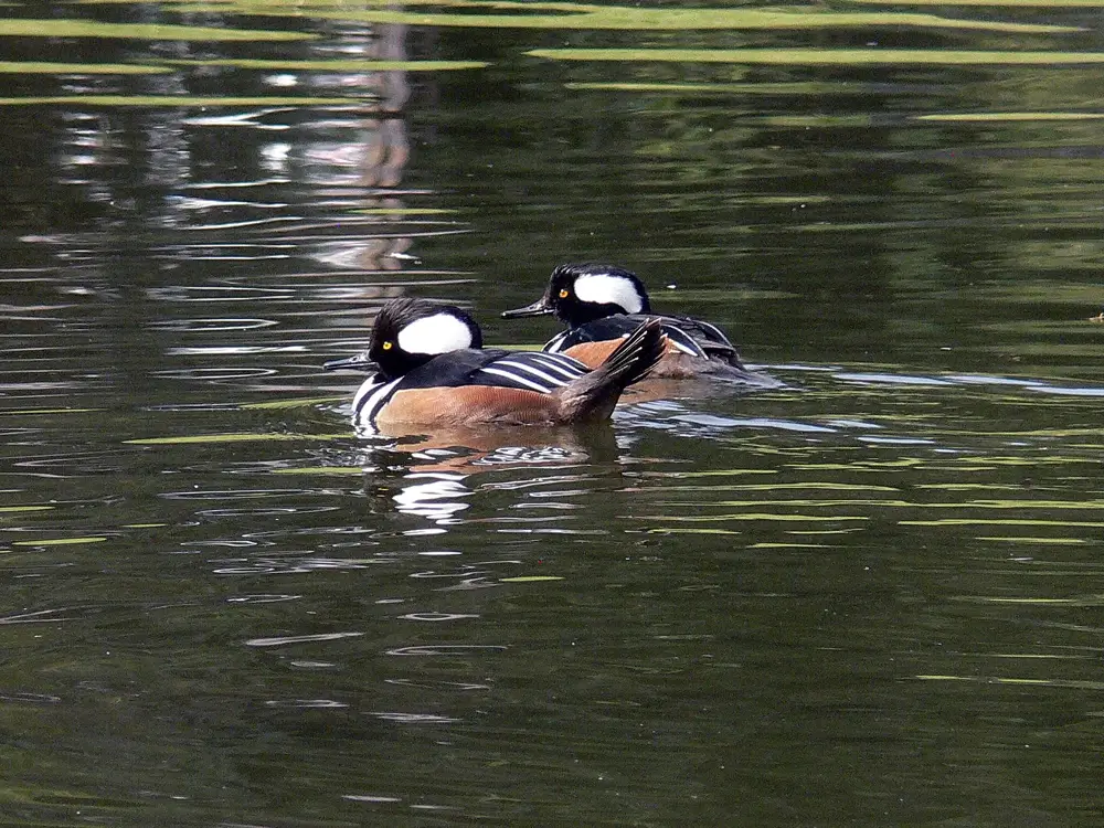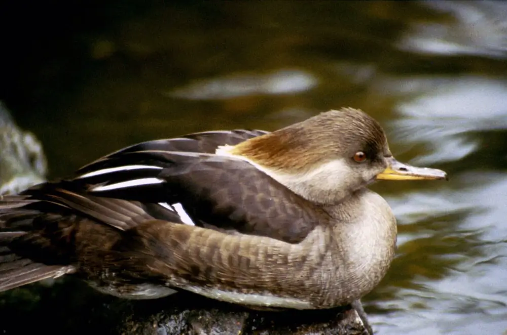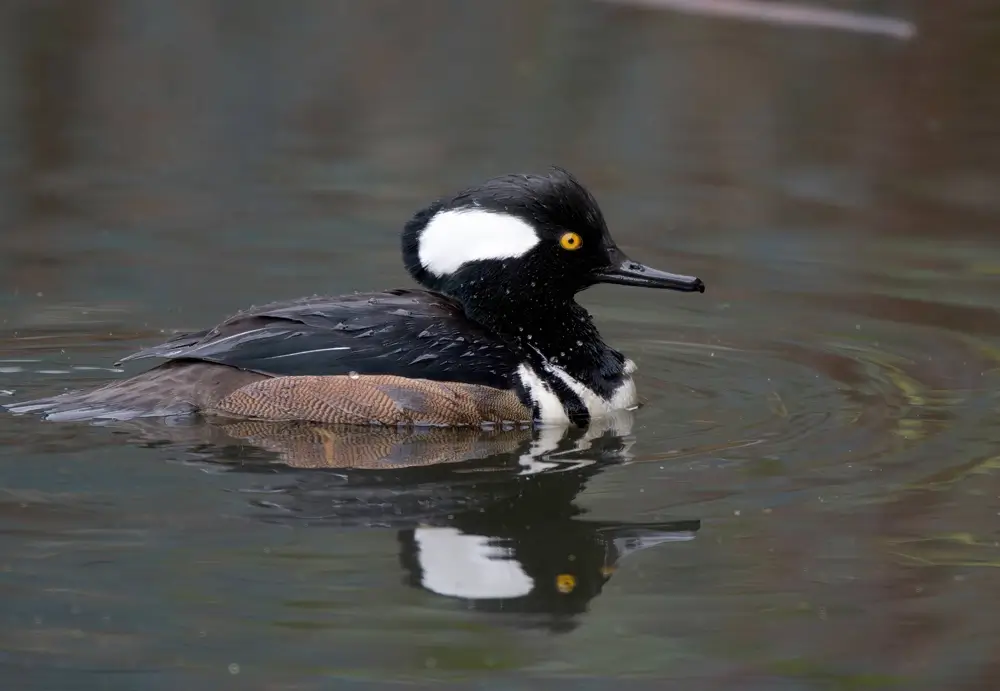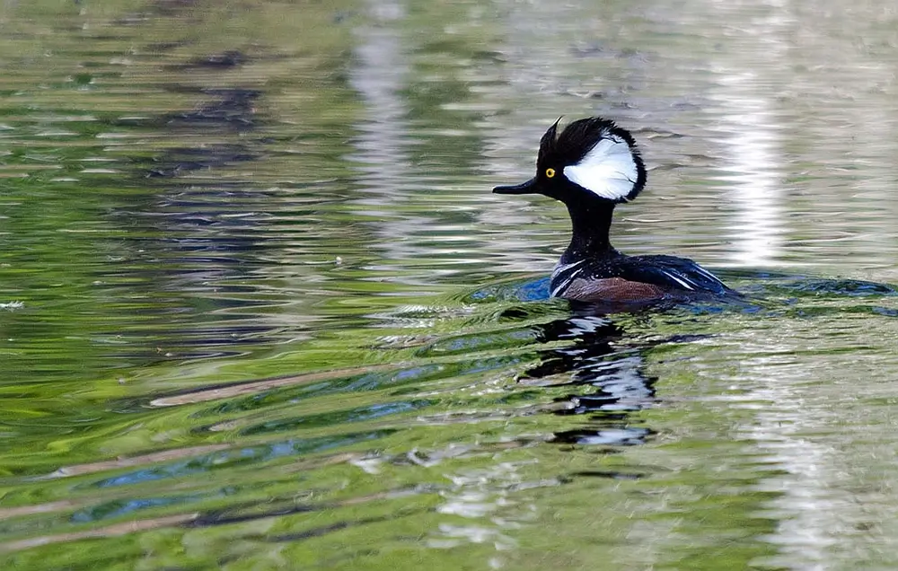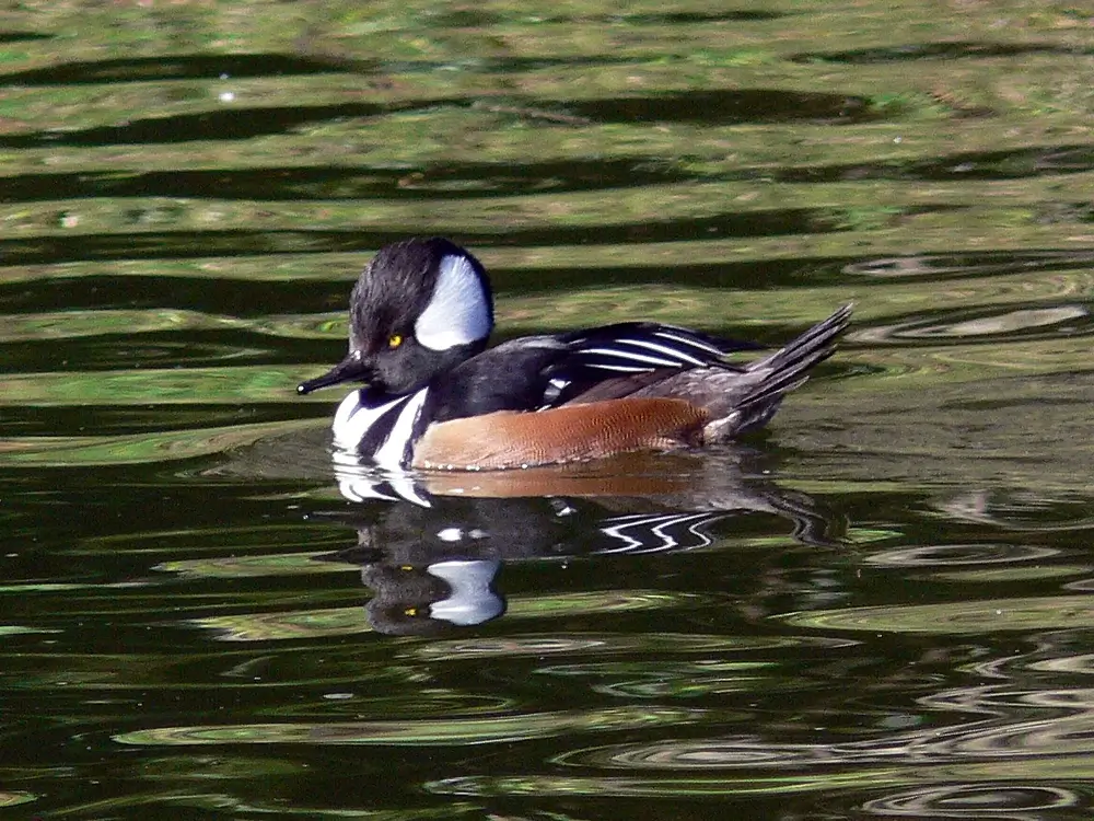 The adult male hooded merganser has a white fan-shaped crest on its head. He has bright yellow eyes, a black head, a white chest with two black stripes, a brownish-black back, rust-colored sides, and a grayish-brown rump and tail.