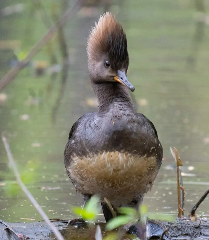 The female hooded merganser has brown eyes, a reddish crest, and grayish-brown feathers.