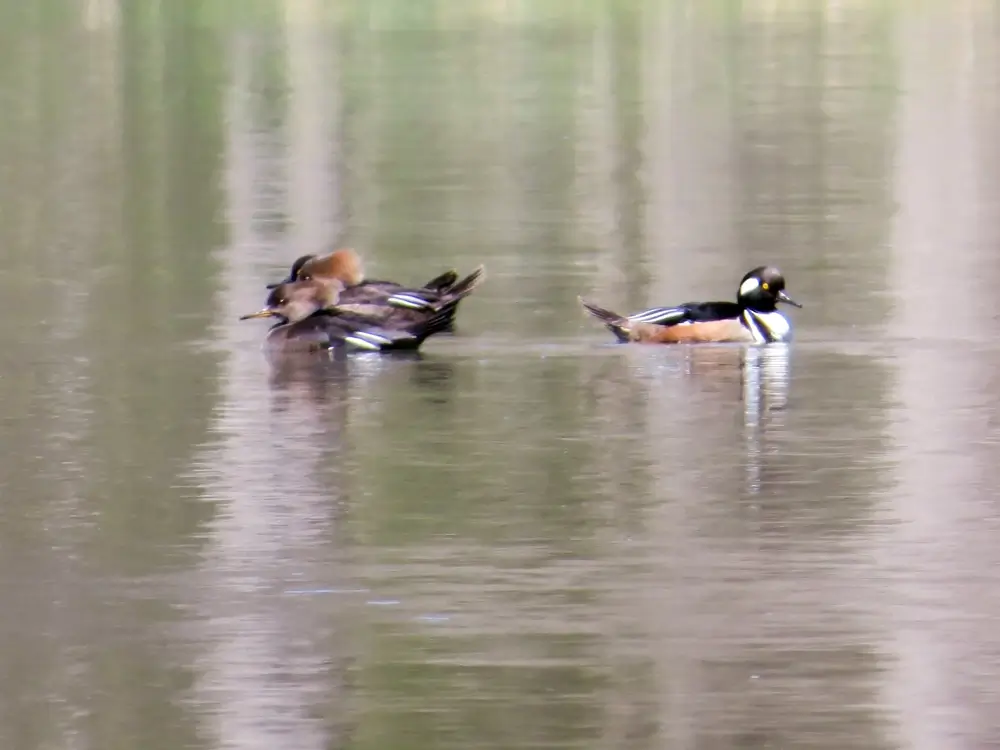 The hooded merganser usually gathers in small groups of no more than 10-12 individuals. When they are startled, they fly away. They are one of the fastest flying ducks.