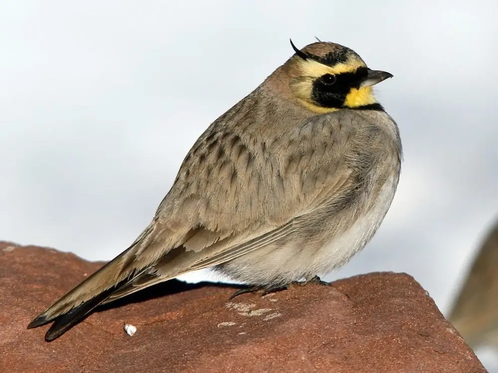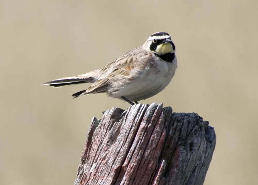 The horned lark is the only lark native to North America. It is 6-8 inches (cm) in length and has a wingspan of 12-13 inches (cm). It has a tan back, a black, crescent-shaped patch on its breast, a black stripe on its face, and a black tail.