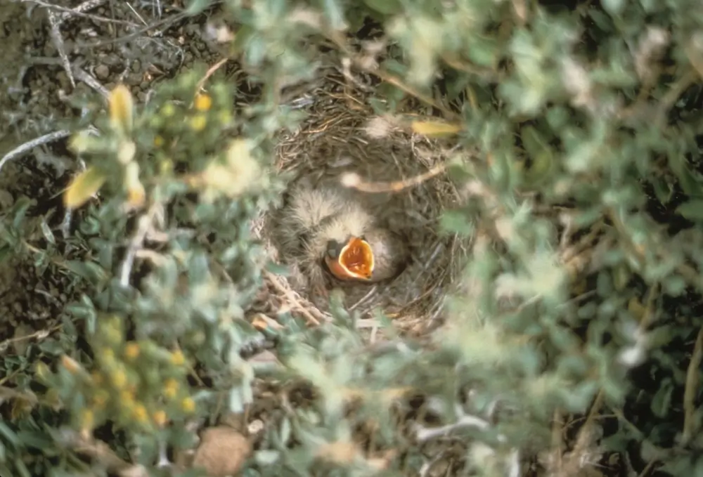 The female lays 2-5 eggs in a nest made of woven grasses and other plants. The nest is lined with feathers and made in a depression in the ground. The female incubates the eggs for 10 to 14 days.