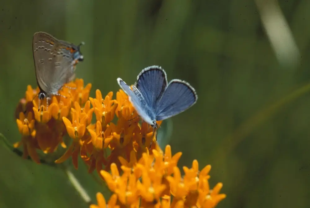 When the Karner butterfly emerges, it expands its wings and dries them for about 45 minutes. It then gathers nectar from wildflowers. Karner blue butterflies live for only a week or two.