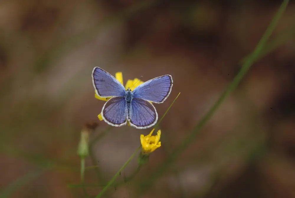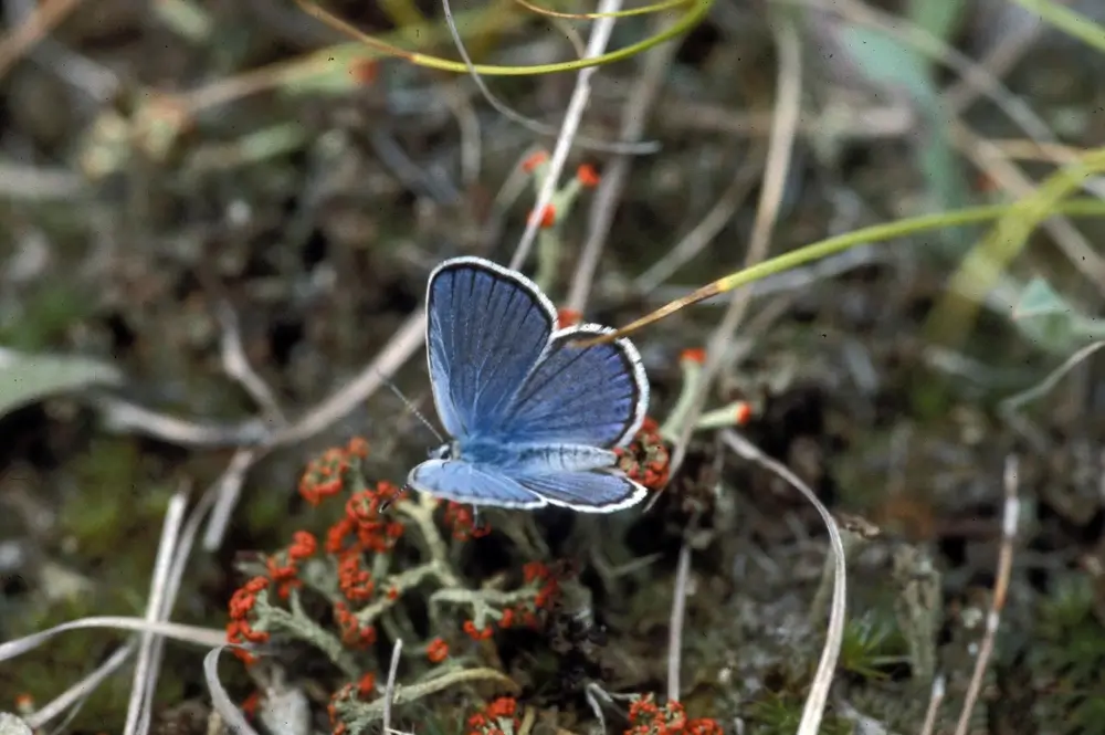 The Karner blue butterfly is found in dry sandy areas with open woods and clearings like pine barrens, lakeshore dunes, and sandy pine prairies that contain lots of wild blue lupine.