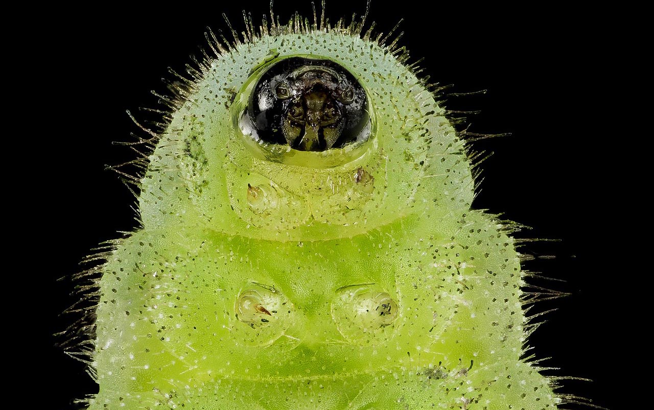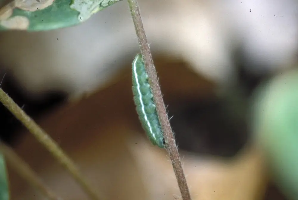 When the caterpillars hatch, they are tiny, less than a third of an inch or a few millimeters long. They crawl up the lupine plant and begin to eat the leaves. They eat the leaves of the blue lupine for three to four weeks and then form a chrysalis and pupate for 8-11 days.