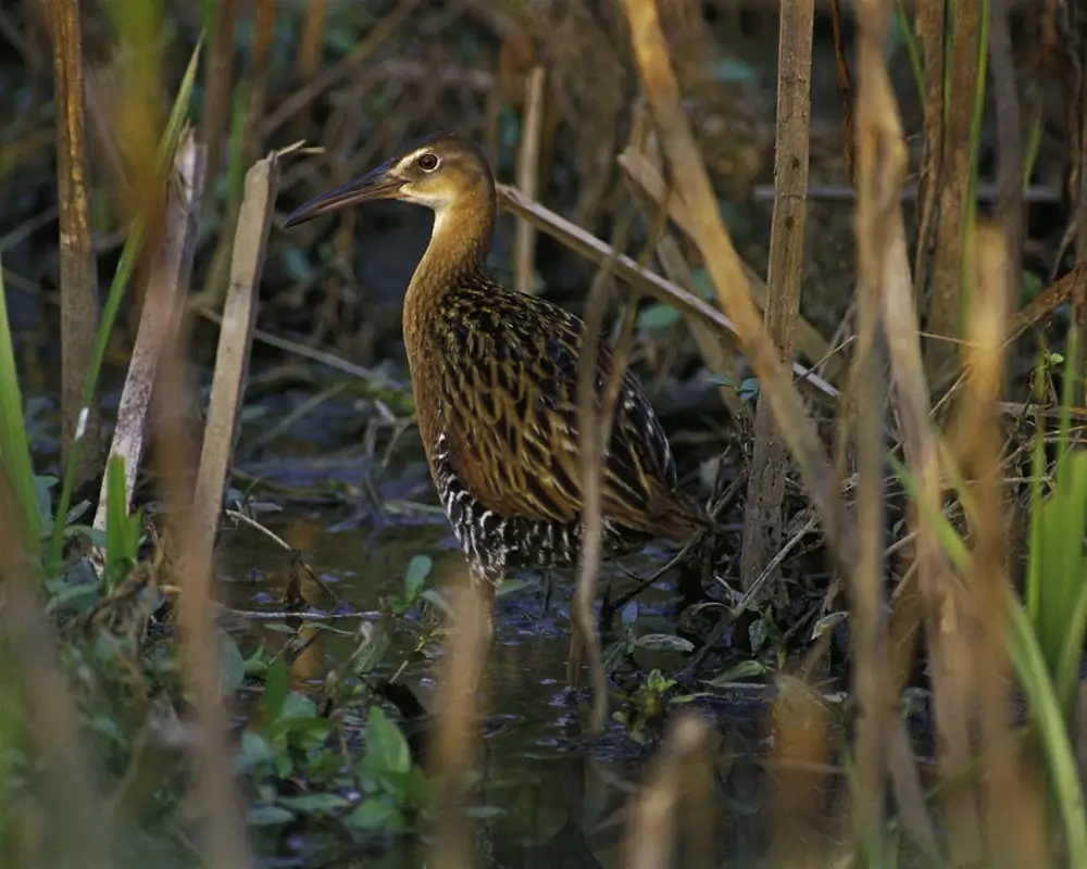 The king rail is found in rice fields in the southern United States and coastal saltwater marshes along the East Coast.