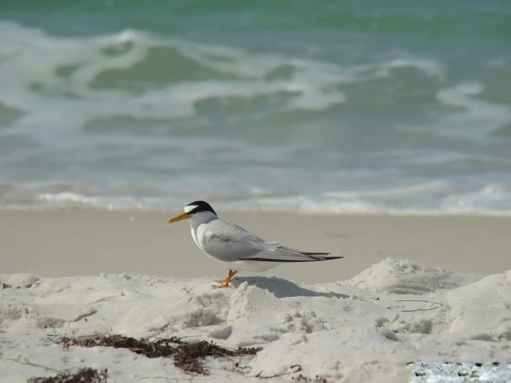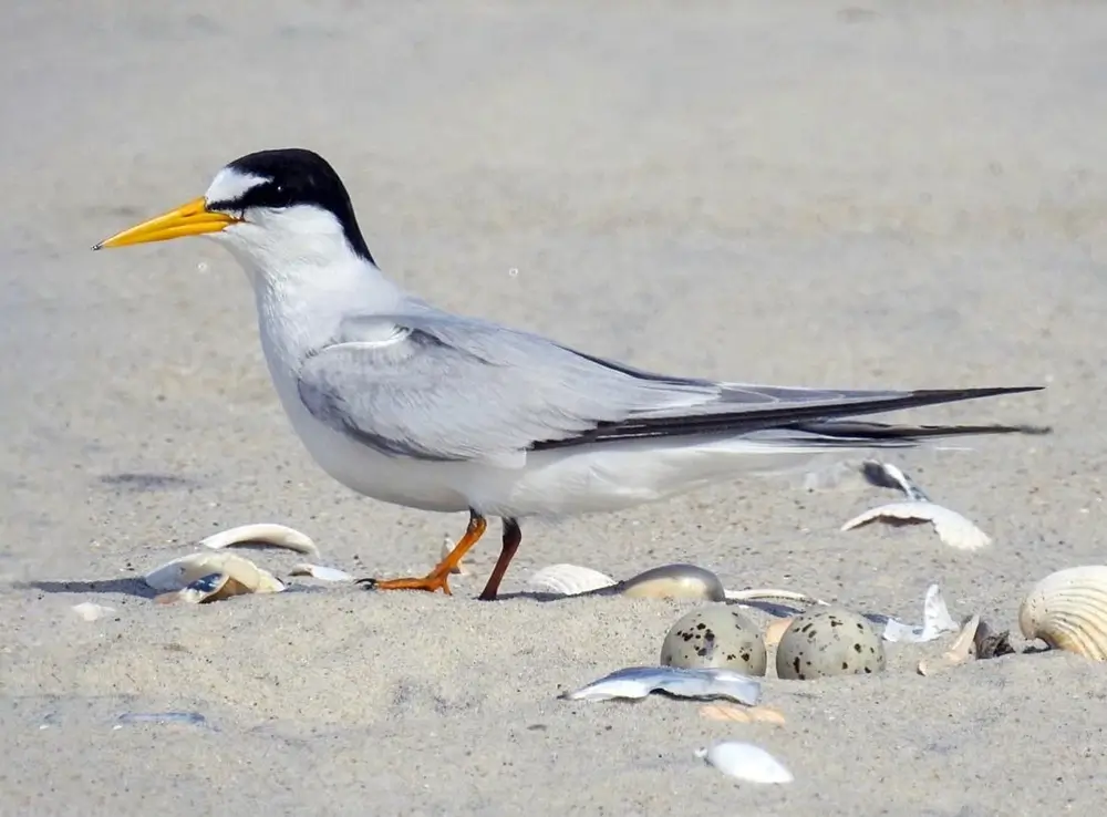 The least tern is found on sandy and pebbly beaches and on sandbars in large rivers.