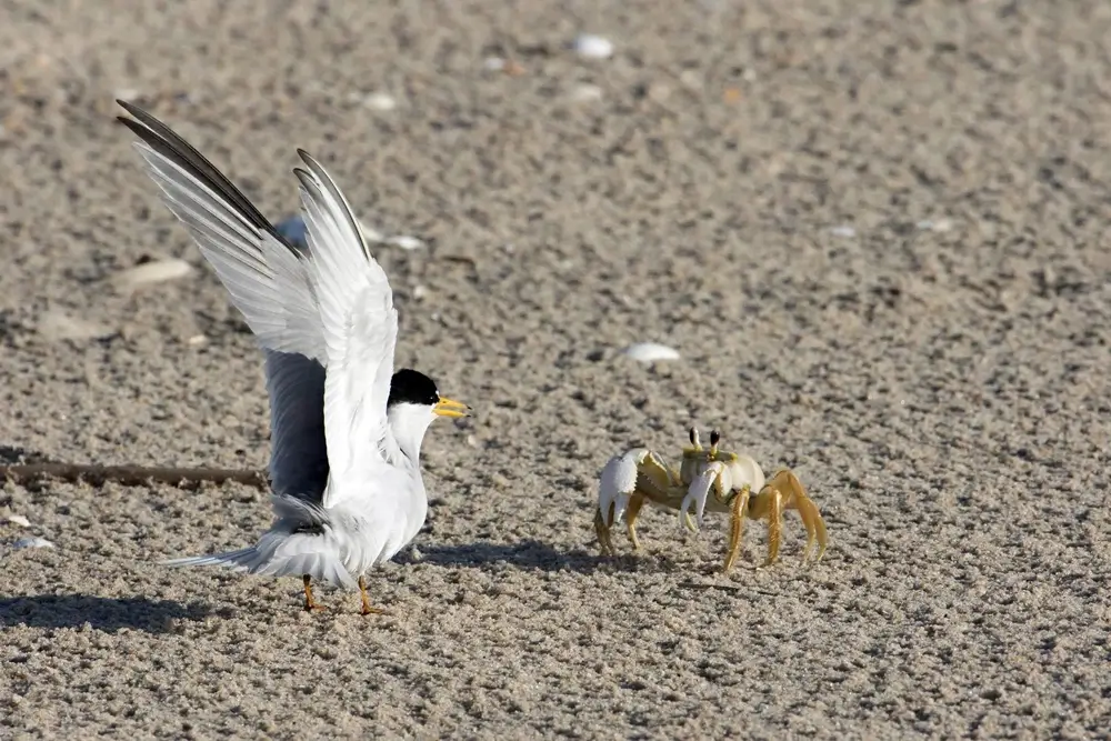 The least tern dives into the water from the air and catches small fish and invertebrates.