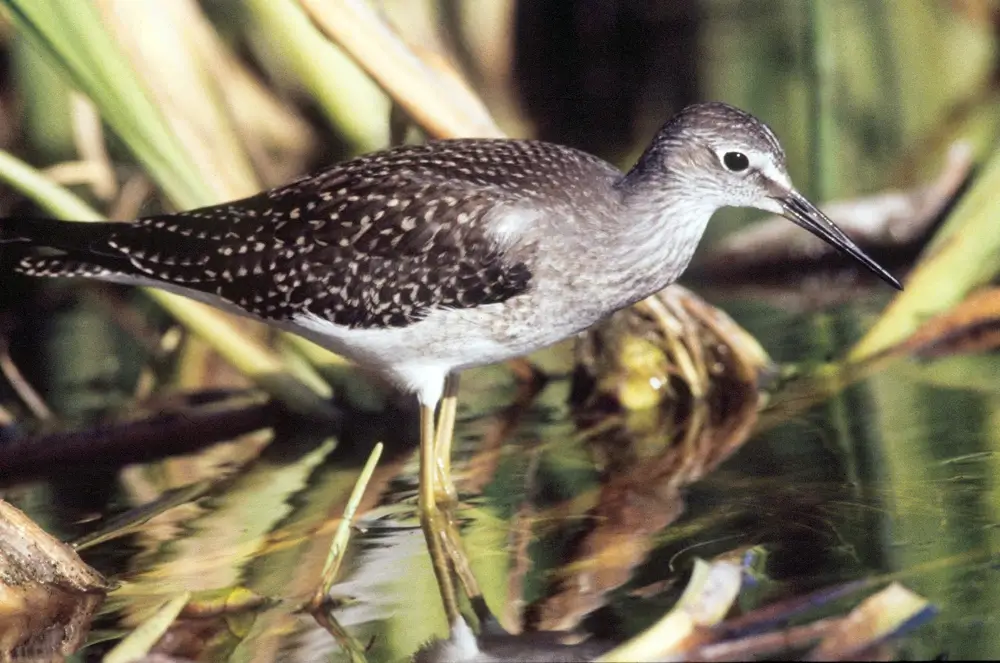 It has a long, straight bill; a long neck; and a speckled brown body with a white belly and a gray rump. It gets its name from its very long, bright yellow legs. Males and females look alike.