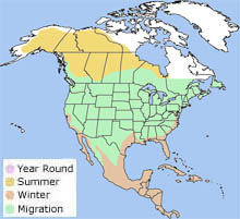 It winters in the southern United States southward to southern South America and northward along the coasts to southern central California and New Jersey.