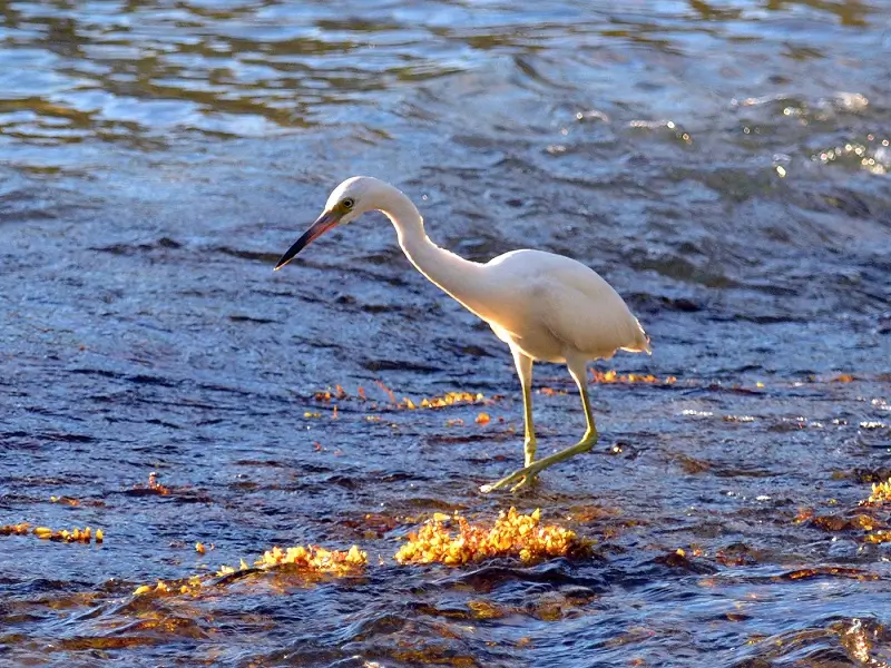 Young little blue herons are white and have blue bills with a black tip and dull green legs. When immature little blue herons are molting into their adult plumage, they can be a mix of white and blue.