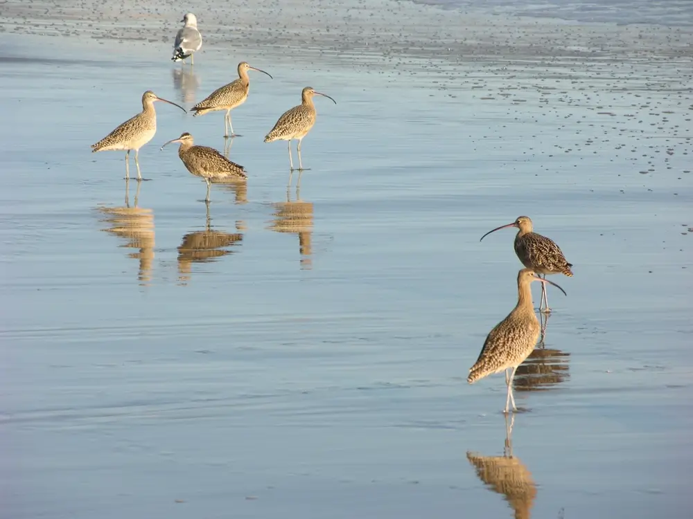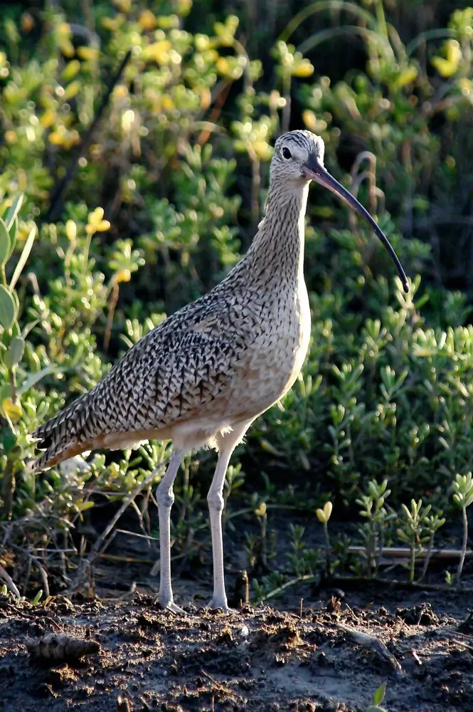 The long-billed curlew breeds on plains, grasslands, and prairies. It spends the winter on lake and river shores, marshes, mudflats, and sandy beaches.