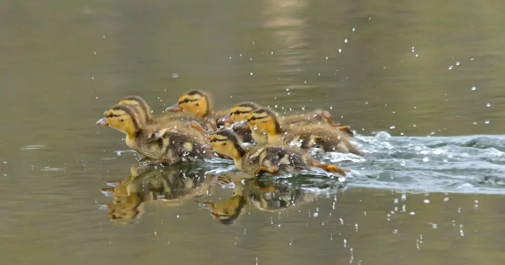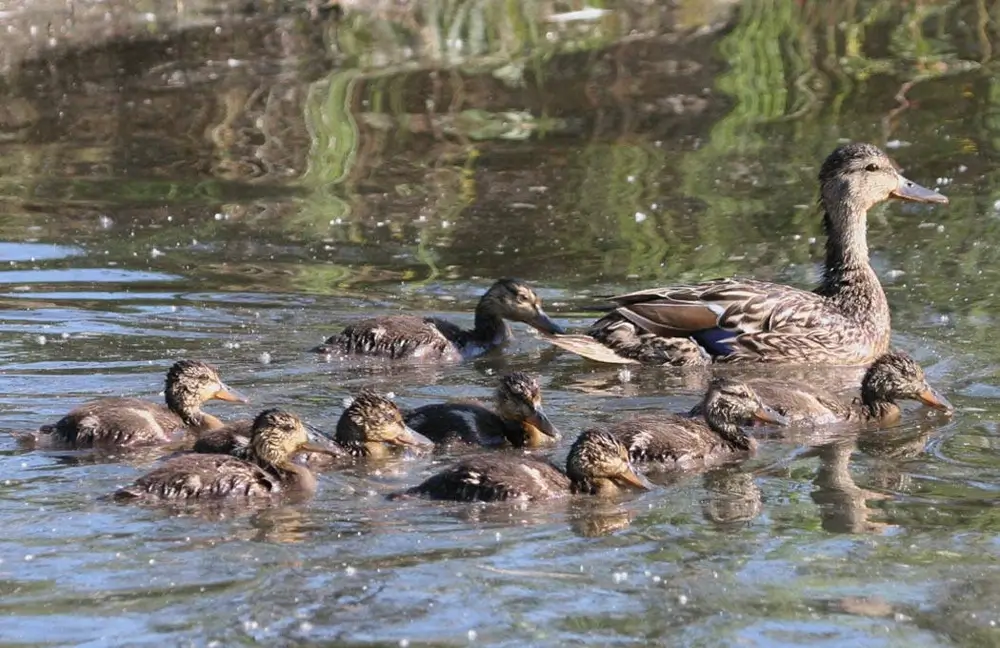 Within a day of hatching, the mother leads the chicks to water for their first swim. The chicks fledge when they are about eight weeks old.